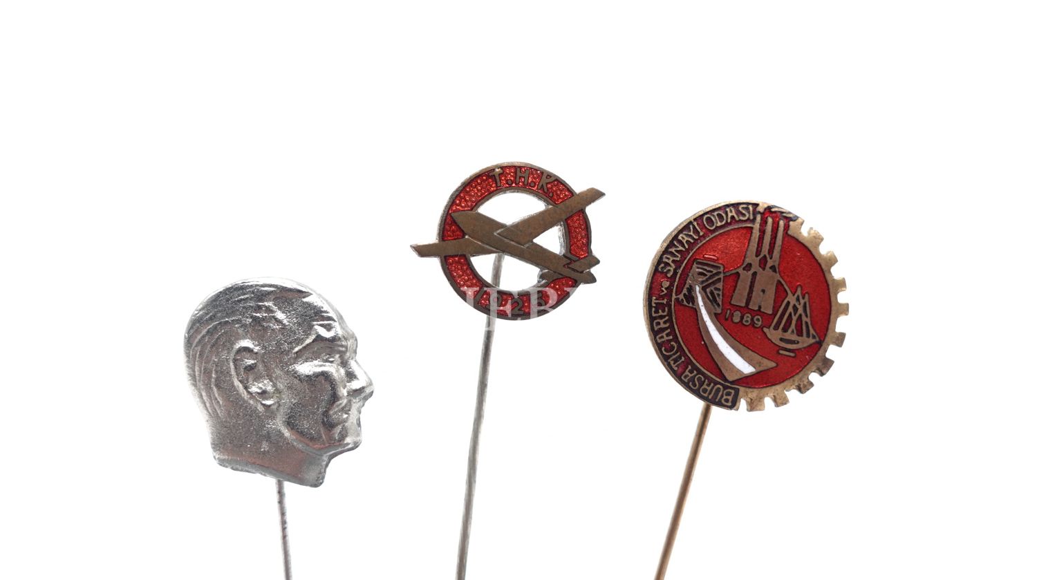 "Atatürk görseli" ve "Bursa Ticaret ve Sanayi Odası", "T.H.K" yazılı 3 adet mineli rozet lotu