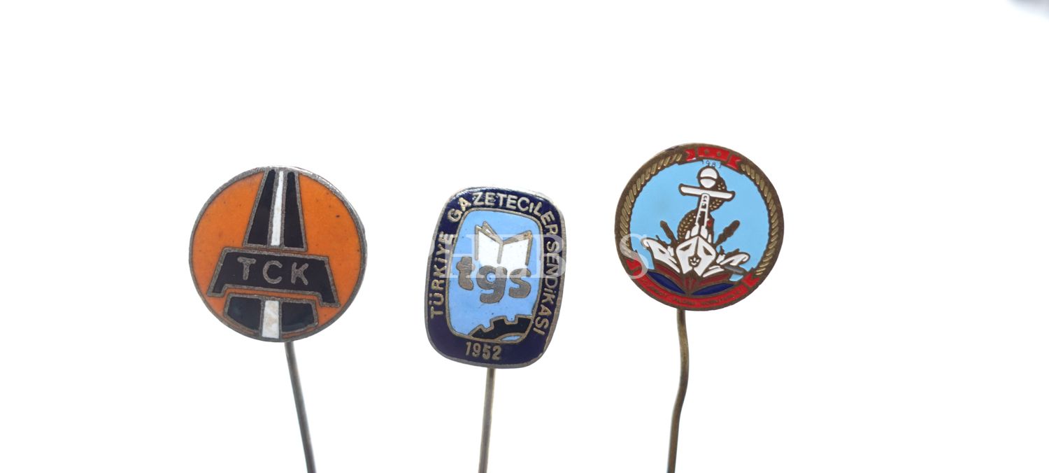 "Türkiye Gazeteciler Sendikası" yazılı rozetin bulunduğu 3 adet rozet lotu