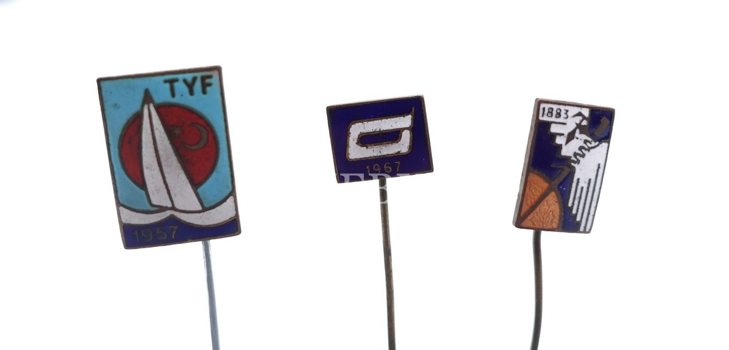 Yelkenli görselli "TYF (1957)" yazılı rozetin bulunduğu 2 adet rozet lotu