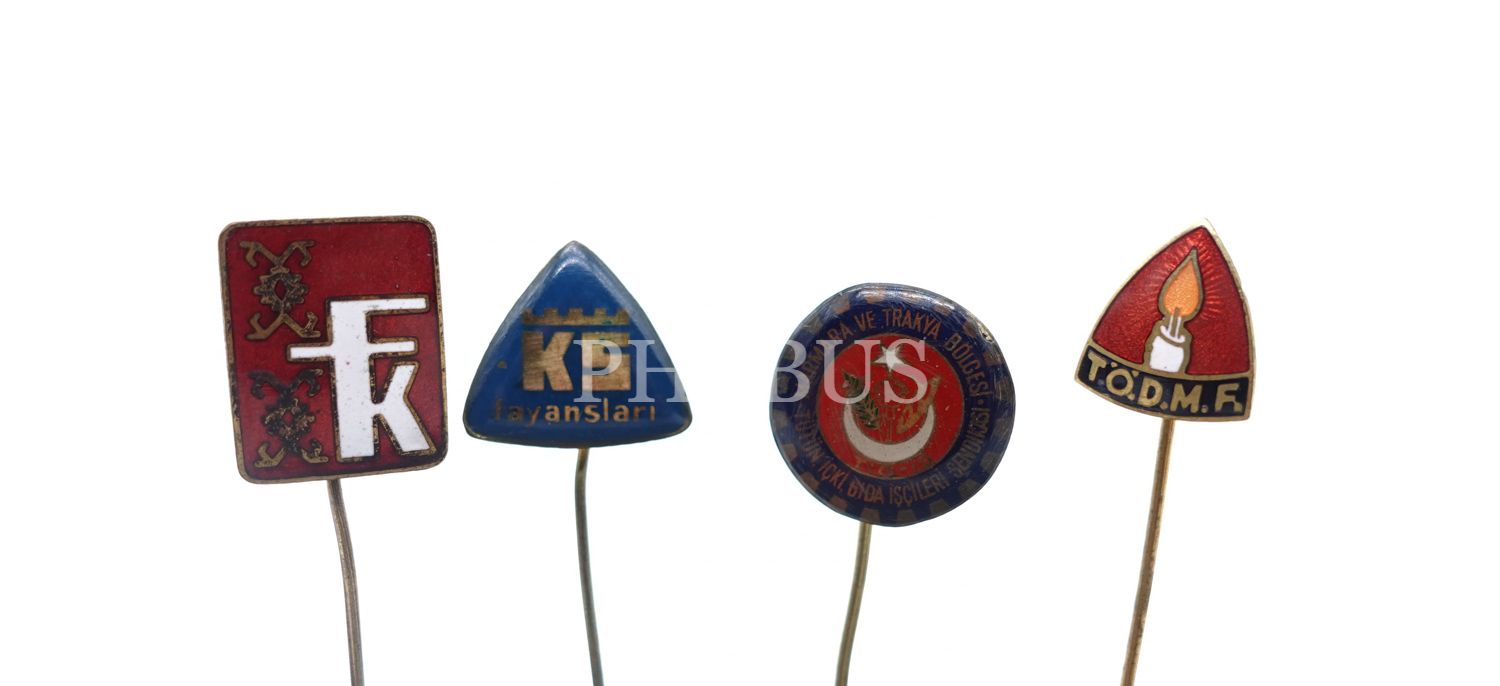 "Marmara ve Trakya Bölgesi, Tütün, İçki ve Gıda İşçileri Sendikası" yazılı rozetin bulunduğu 4 adet rozet lotu