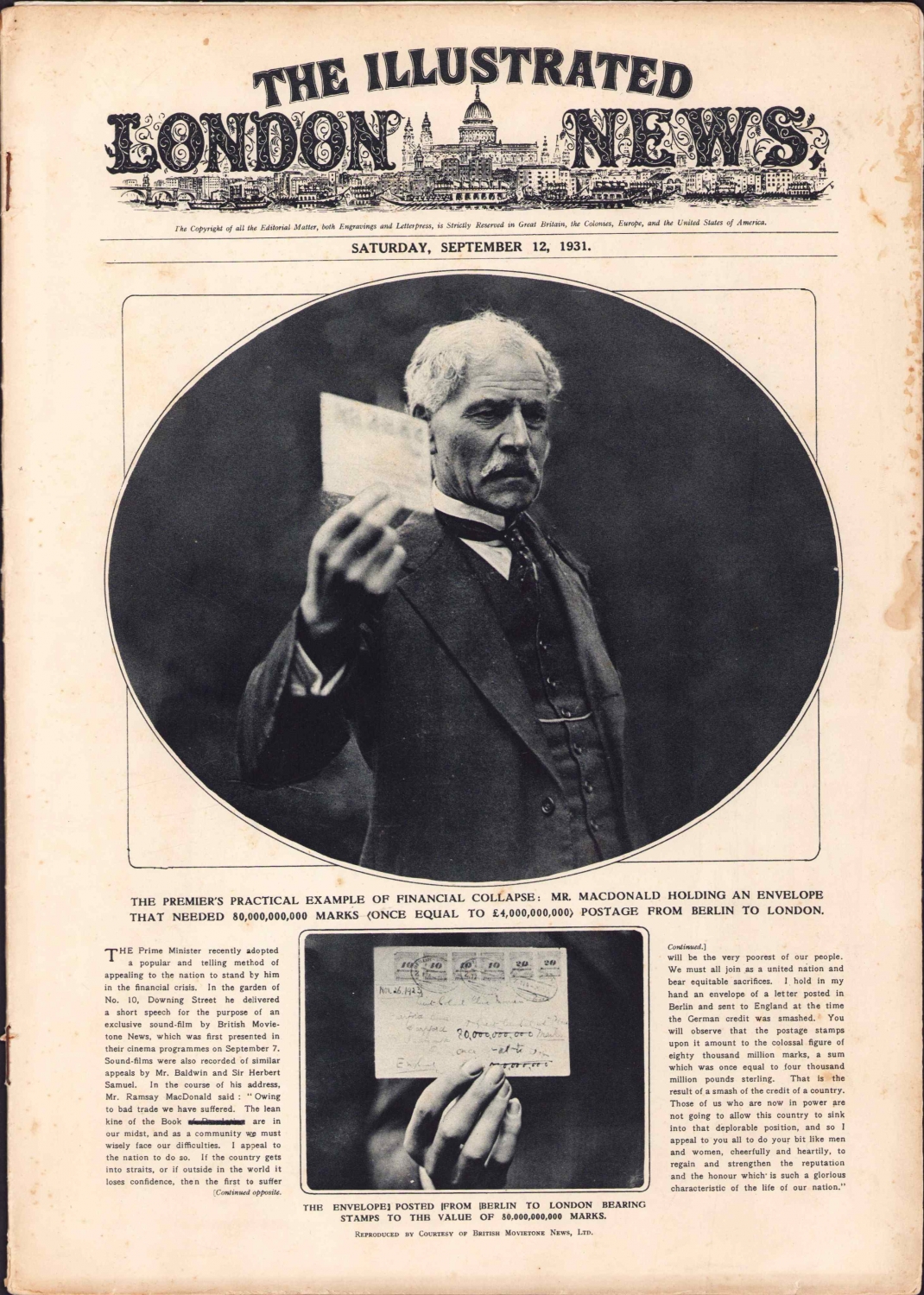 The Illustrated 1931, "Öncülerin pratikte nihai çöküş örneği: Bay macdonald, Berlin'den Londra'ya 80.000.000.000 mark posta ücreti gerektiren bir zarf tutuyor, resimli, 40 sayfa, 28x38 cm