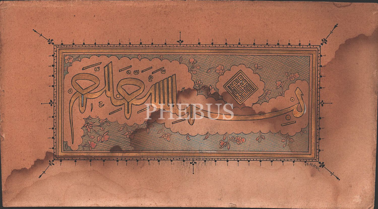 Süheyl Ünver´in talebesi ve yeğeni Nilüfer [Akdeniz] Plevnelioğlu imzalı, altın tezhipli Besmele-i Şerife, 22x12 cm...