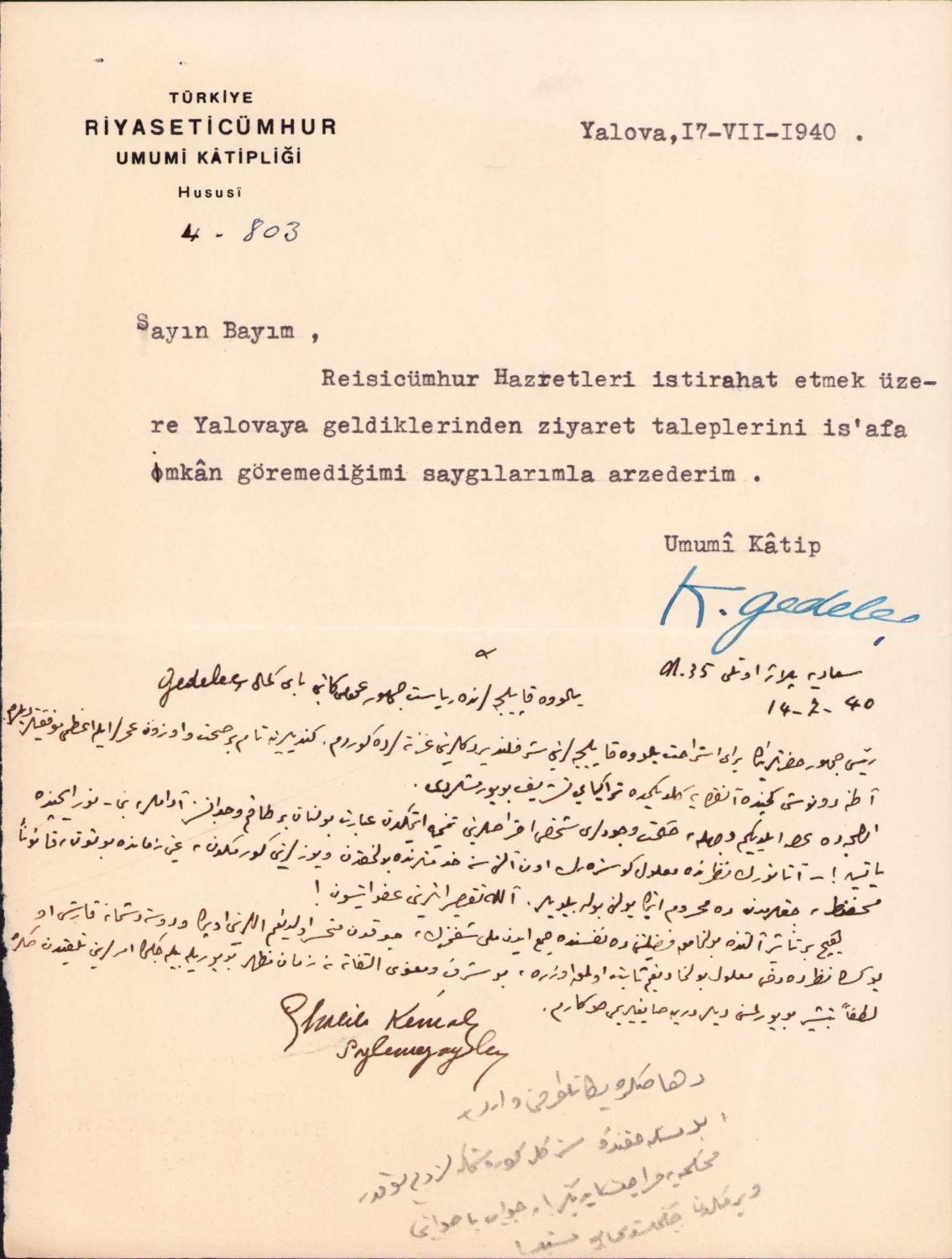 Türkiye Riyaseticumhur Umumi Katipliği antetli Türkçe - Osmanlıca evrak, 1940 tarihli, 17x24 cm