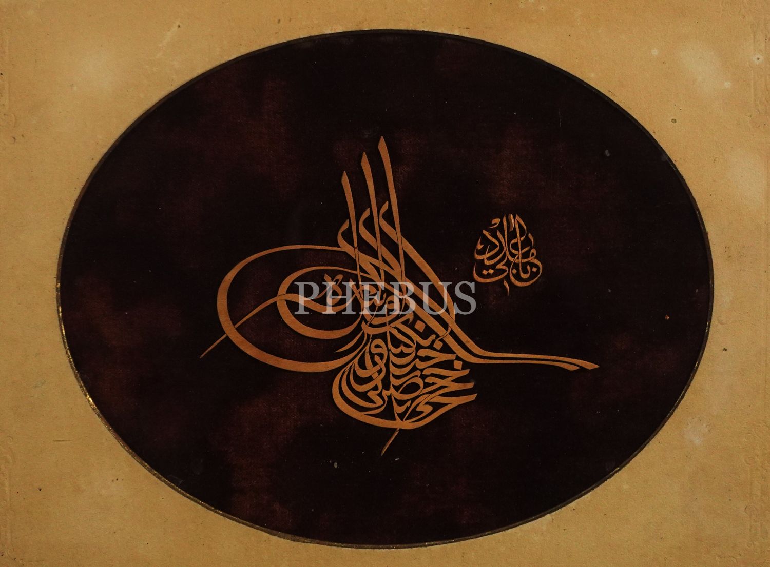 Osmanlı döneminden, Hünkar Hacı Bektaşî Veli adına düzenlenmiş tuğra formunda kat´ı levha, 47x40 cm...