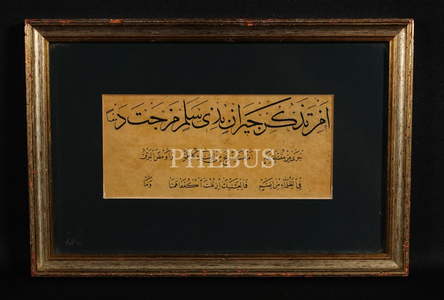 Hoca işi, sülüs, nesih yazı ile yazılmış Kaside-i Bürde meşki, yazı: 20x8 cm, çerçeve: 31x20 cm...