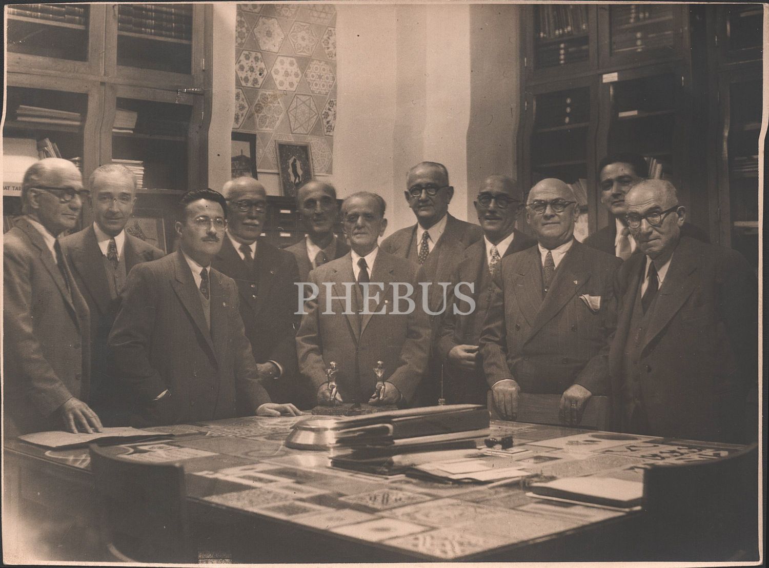 Süheyl Ünver´in Süleymaniye Kütüphanesi´nde yer alan odasında aralarında Şevket Rado, Ekrem Hakkı Ayverdi´nin de yer aldığı heyetin hatıra fotoğrafı, 23x17 cm...