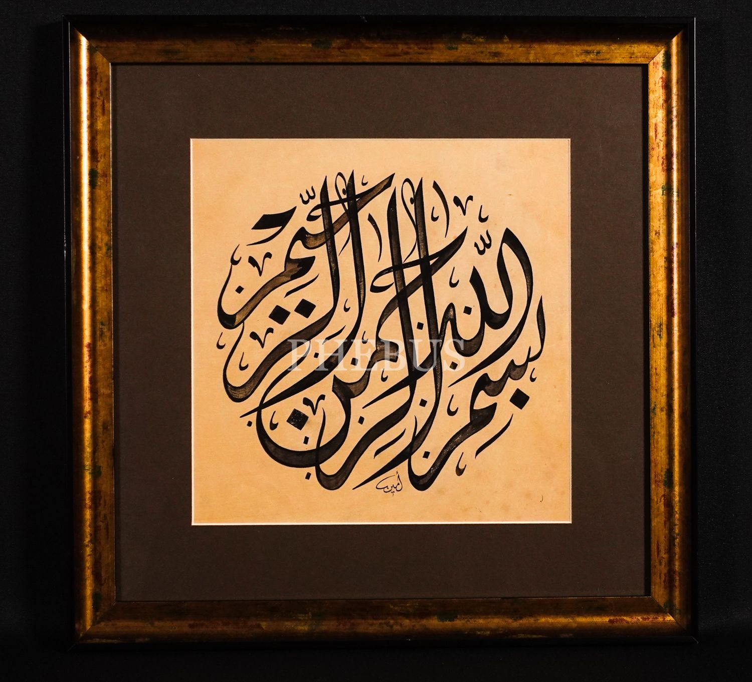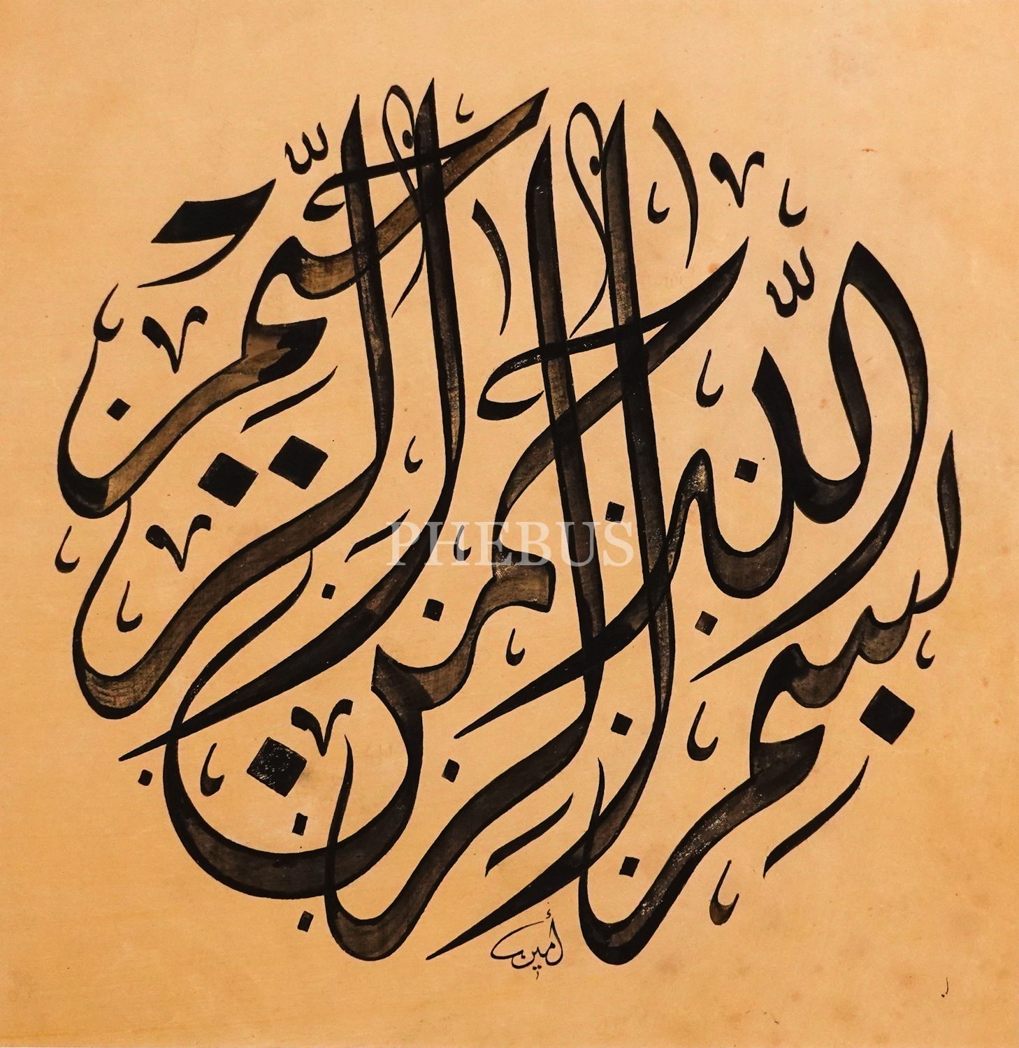 Emin [Barın] ketebeli, dairesel biçimde yazılmış, celi divanî Besmele-i Şerife, yazı: 24x24 cm, çerçeve: 40x40 cm...
