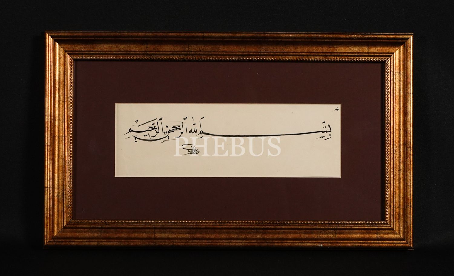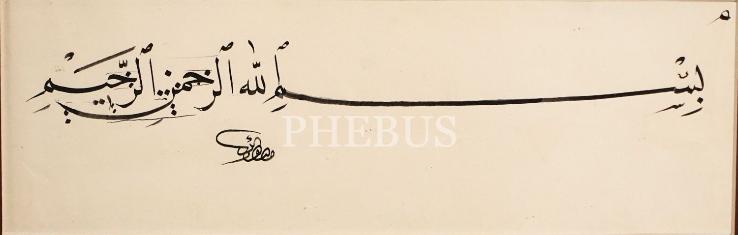 Mustafa Bekir [Pekten] ketebeli, nesih Besmele-i Şerife, yazı: 27x8 cm, çerçeve: 44x25 cm...