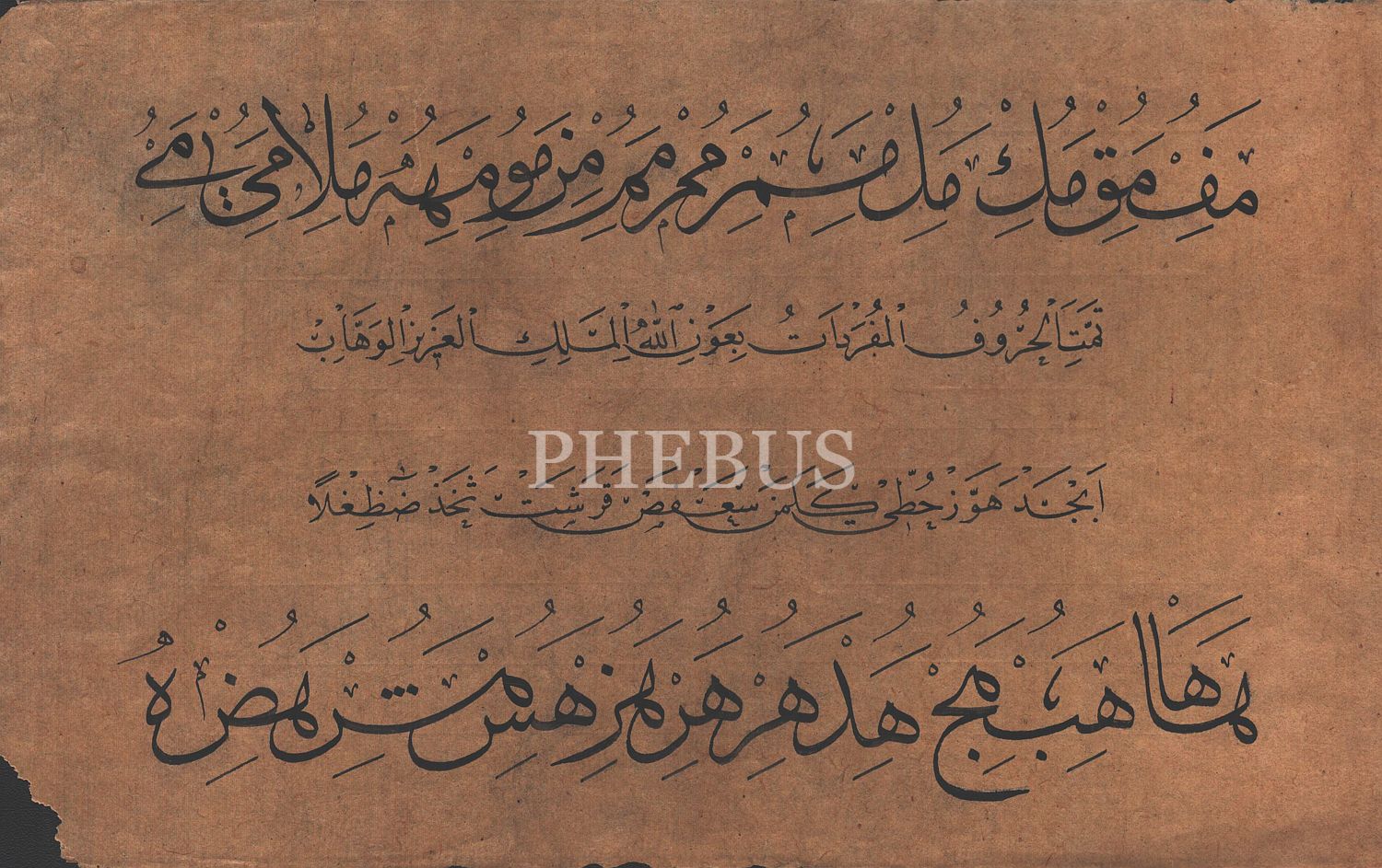 Orta kısmında yer alan satırlarda, "Aziz ve Vehhab olan Allah´ın yardımıyla harfler tamam oldu" anlamına gelen, "Temmeti’l-hurûf ül-müfredatü bi-avnillâhi’l-meliki’l-azizi´l-vehhab" ve Peygamber döneminde de kullanılan Arap alfabesinin ilk düzeni olan "Ebced, hevvez, huttî, kelemen, sa´fes, karaşet, sehaz, dazığlen" yazılıdır.