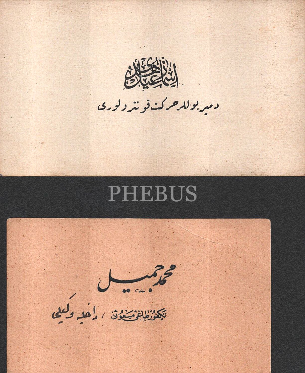 Hamid Aytaç ketebeli, Tekfurdağı Mebusu Mehmed Cemil Efendi´nin kartviziti ve Demiryolları Hareket Kontrolorü İsmail Zühdi Efendi´nin kartviziti, 10x5 cm...