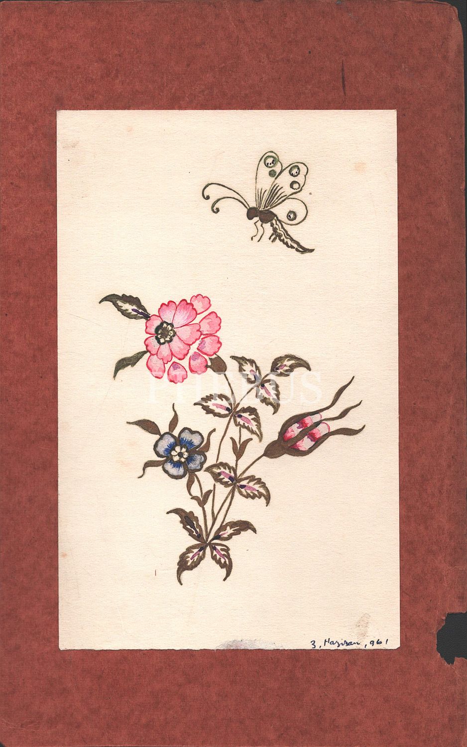 Çicek ve yusufçuk görselli tezhip çalışması, 3 Haziran 1961, 15x24 cm...