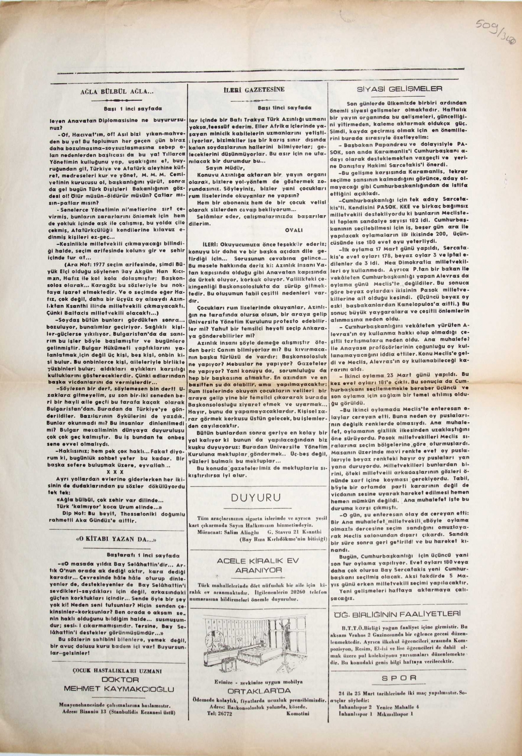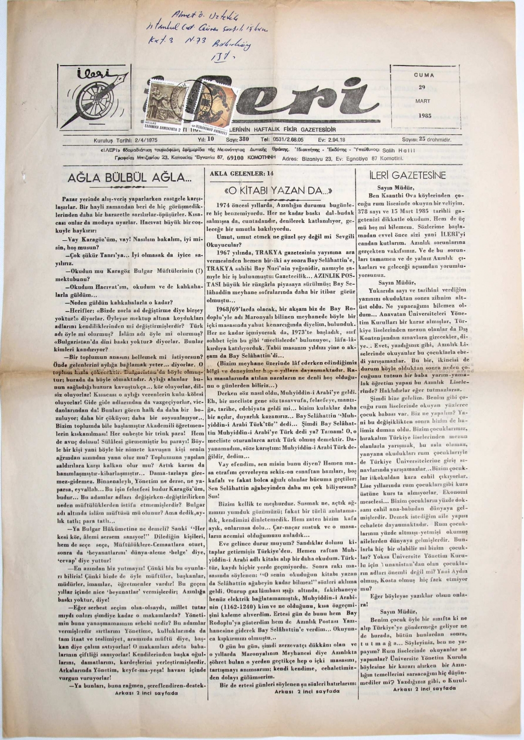 İleri - fikir gazetesi, 1985 tarihli, postadan geçmiş, 2 sayfa, 35x50 cm