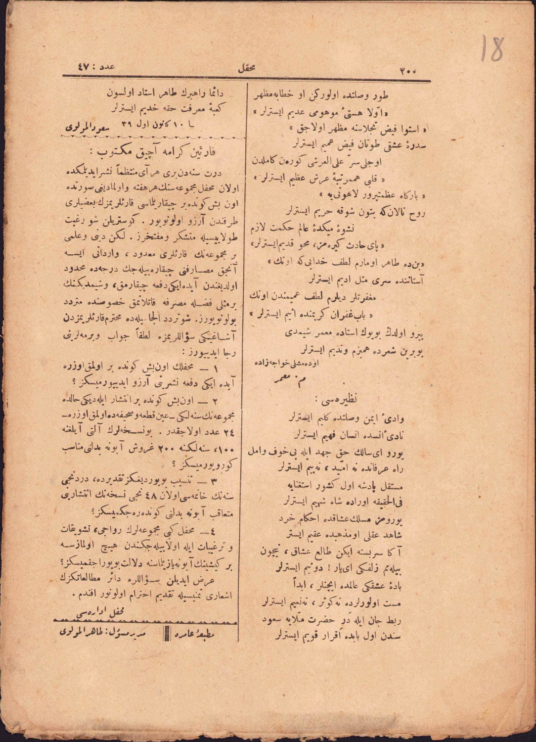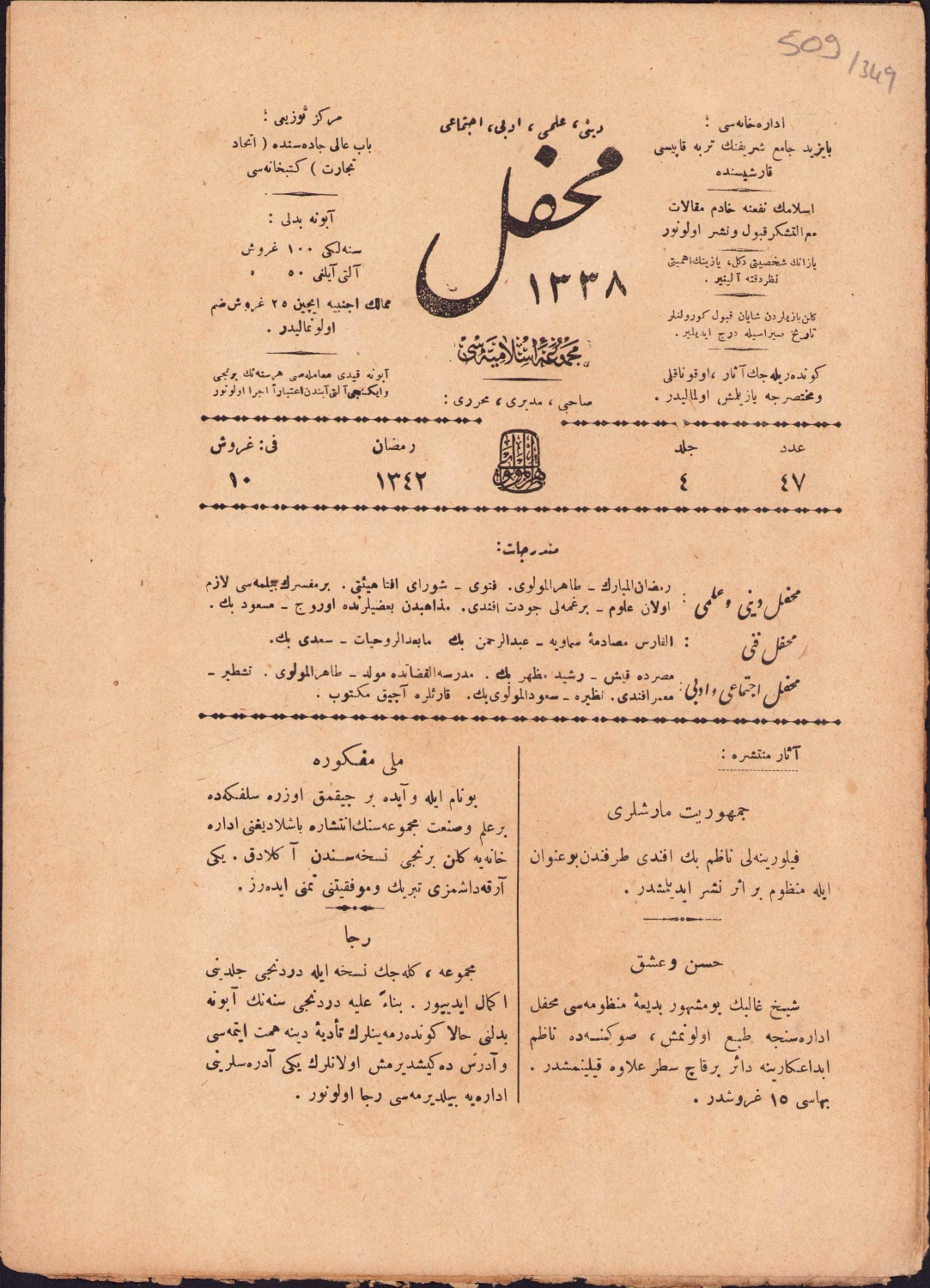 Osmanlıca Mahfil mecmuası, 1338, 10 sayfa, 20x28 cm