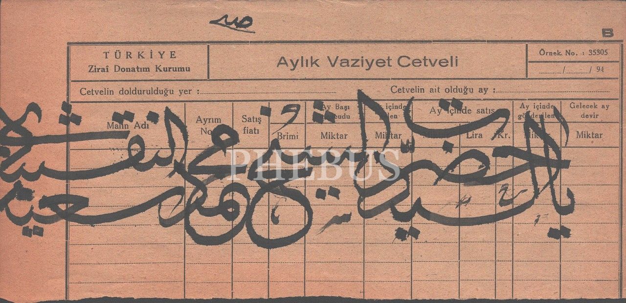 Türkiye Ziraî Donatım Kurumu antetli kağıt üzerine yazılmış sülüs yazı, 25x12 cm...
