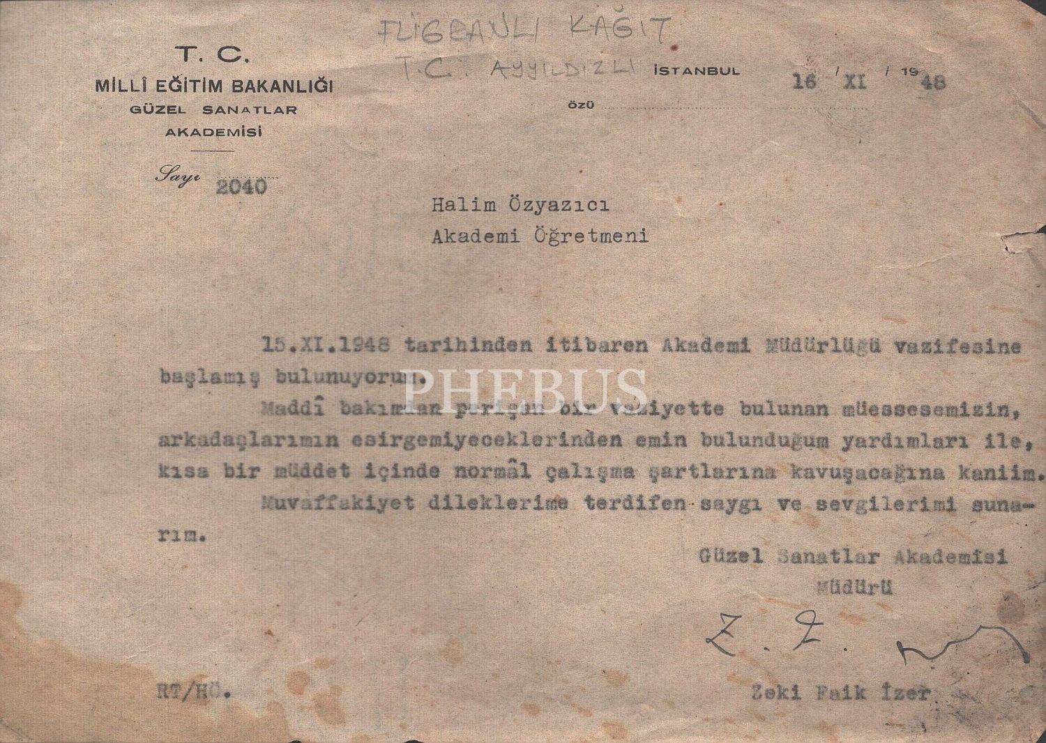 T.C. Milli Eğitim Bakanlığı Güzel Sanatlar Akademisi antetli, Akademi Öğretmeni Halim Özyazıcı´ya hitaben Zeki Faik İzer tarafından gönderilen mektup, 16 Kasım 1948, 21x15 cm...