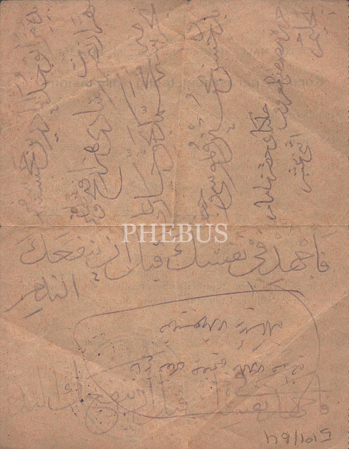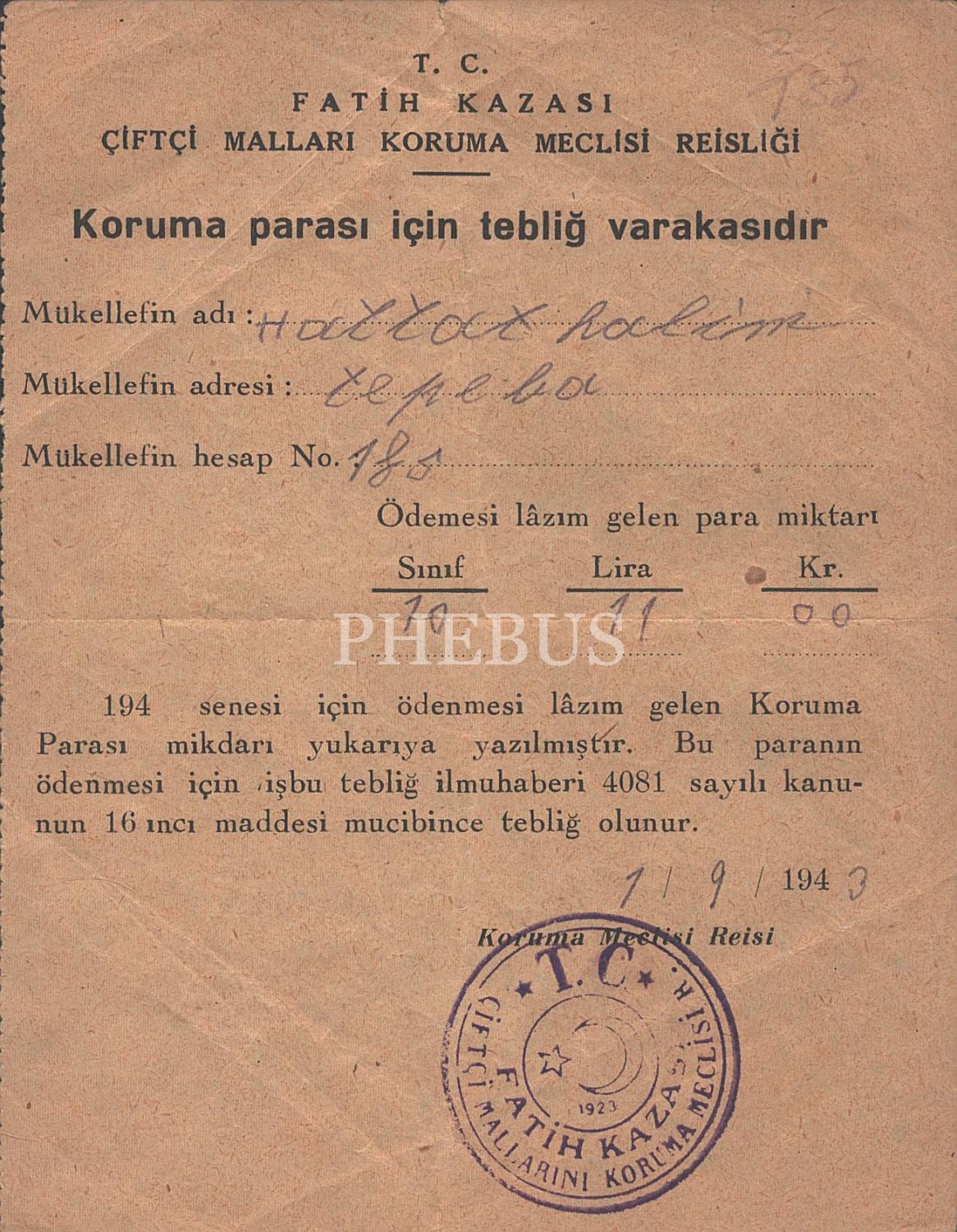 T.C. Fatih Kazası Çiftçi Malları Koruma Meclisi Reisliği antetli, Hattat Halim Özyazıcı´nın Tepebağı´nda bulunan bahçesi için düzenlenmiş makbuz ve arka yüzünde yer alan karalama çalışması,11x14 cm...