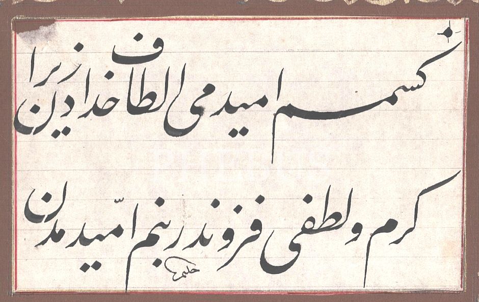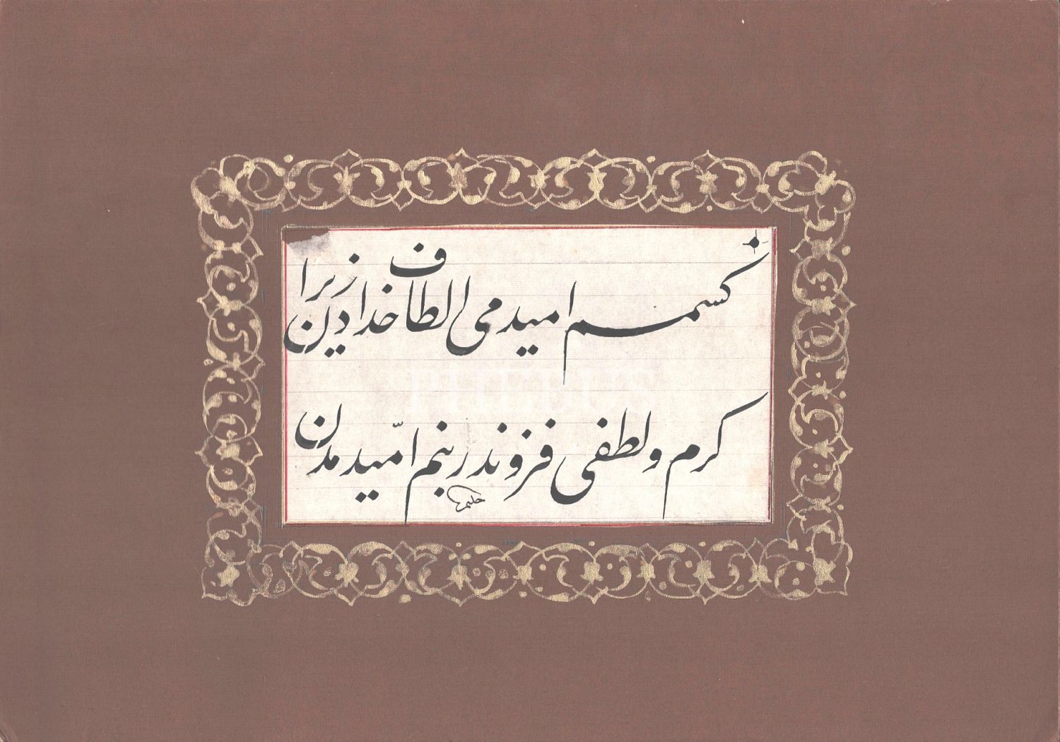 Yazı, "Kesmem ümidimi Eltaf-ı Hüdâ´dan Zira kerem ve lutfu füzündur benim ümidimden." şeklindedir. Ketebe sonradan atılmıştır.