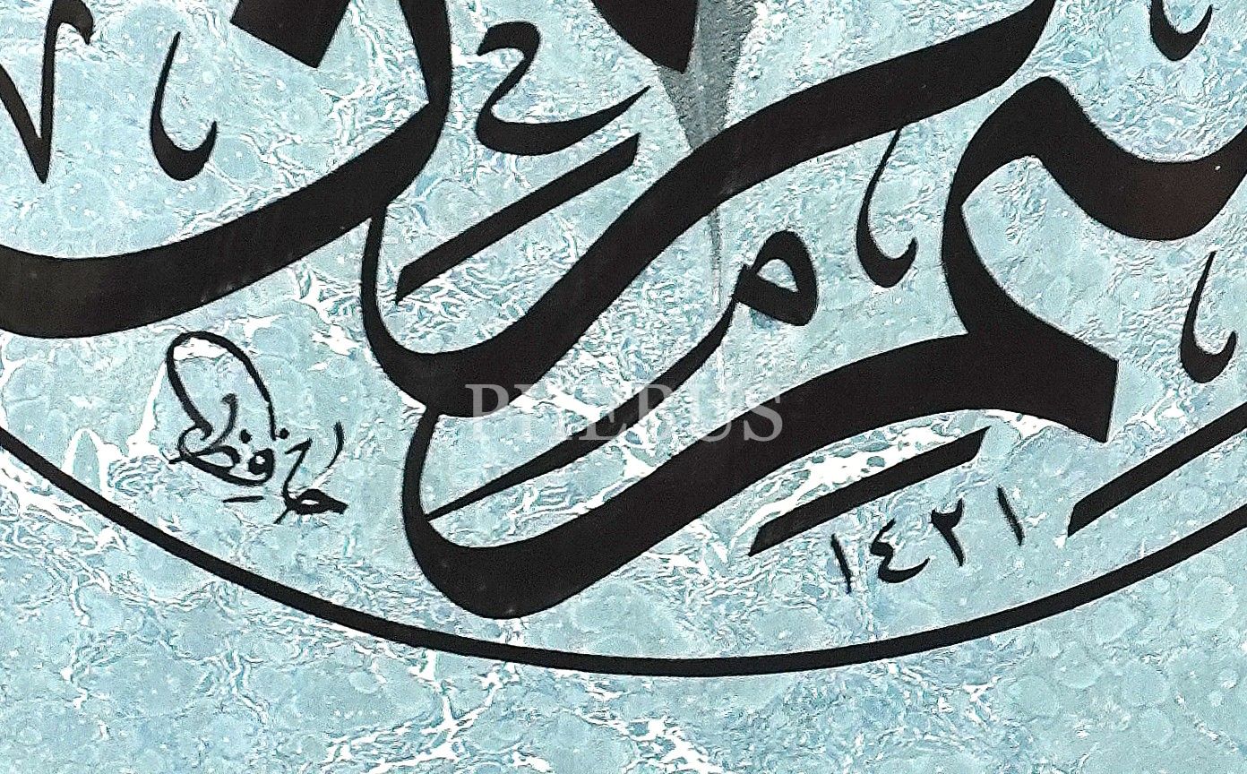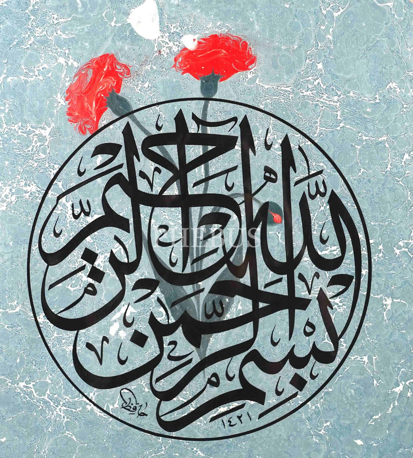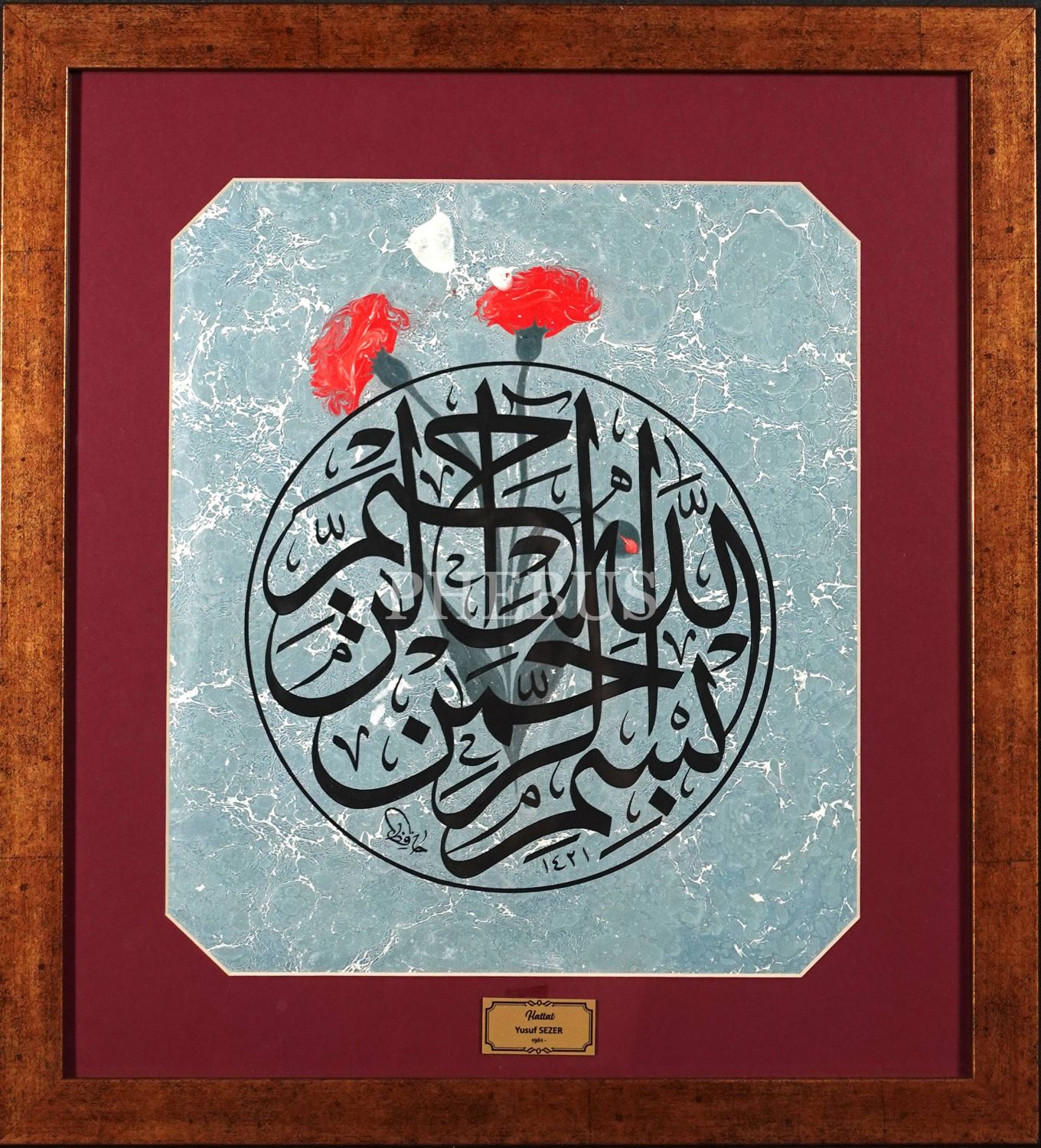 Hafız [Yusuf Sezer] ketebeli, lale ebrusu üzerine celi sülüs Besmele-i Şerife, 1421, ebru: Yunus Özel, çerçeve: 46x50 cm, yazı: 30x35 cm...