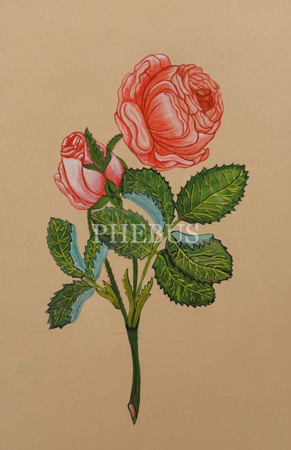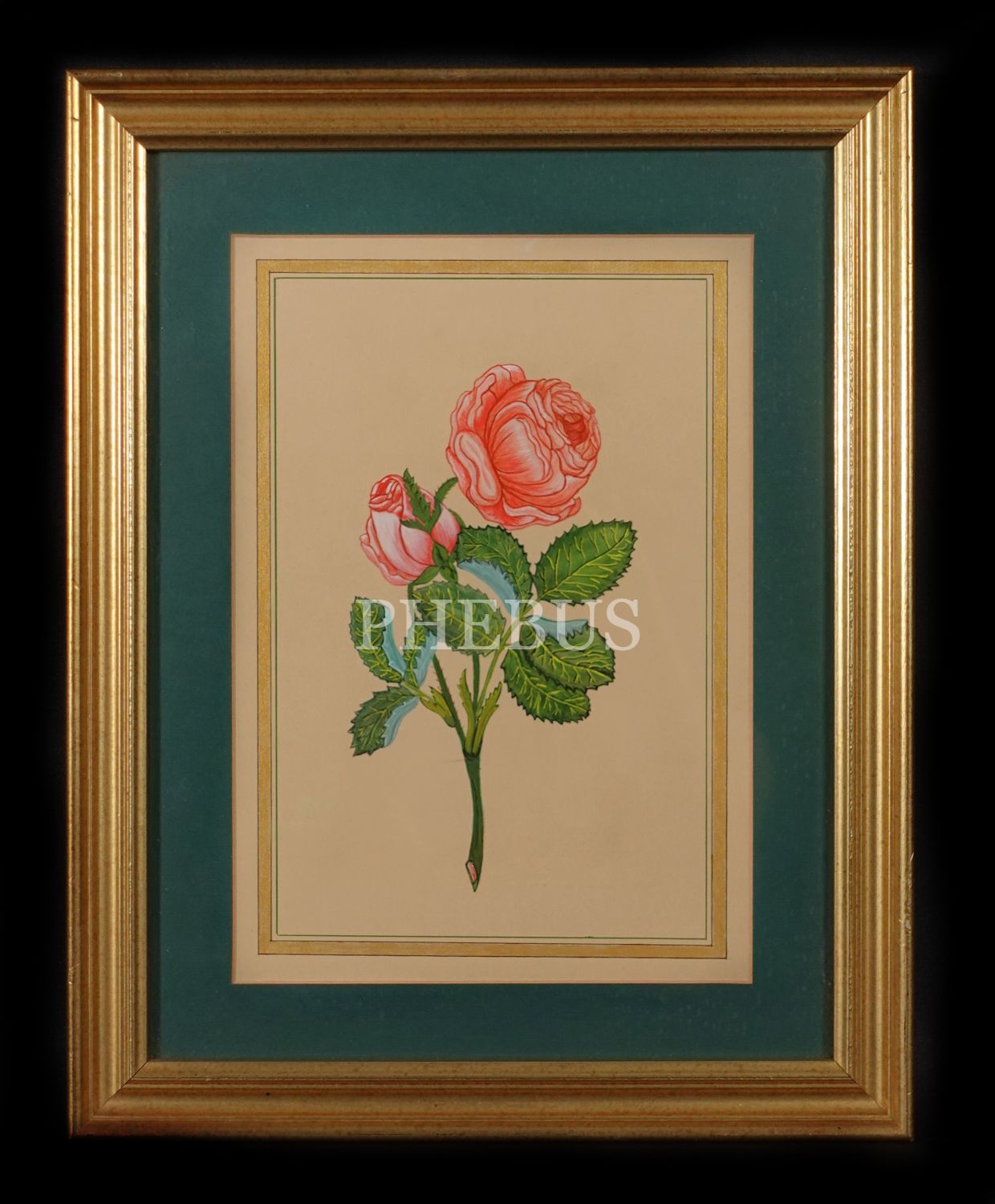 Nilüfer Pilevnelioğlu evrakı içinden, tezhipli ve çerçeve içesinde gül çizimi, 32x40 cm...