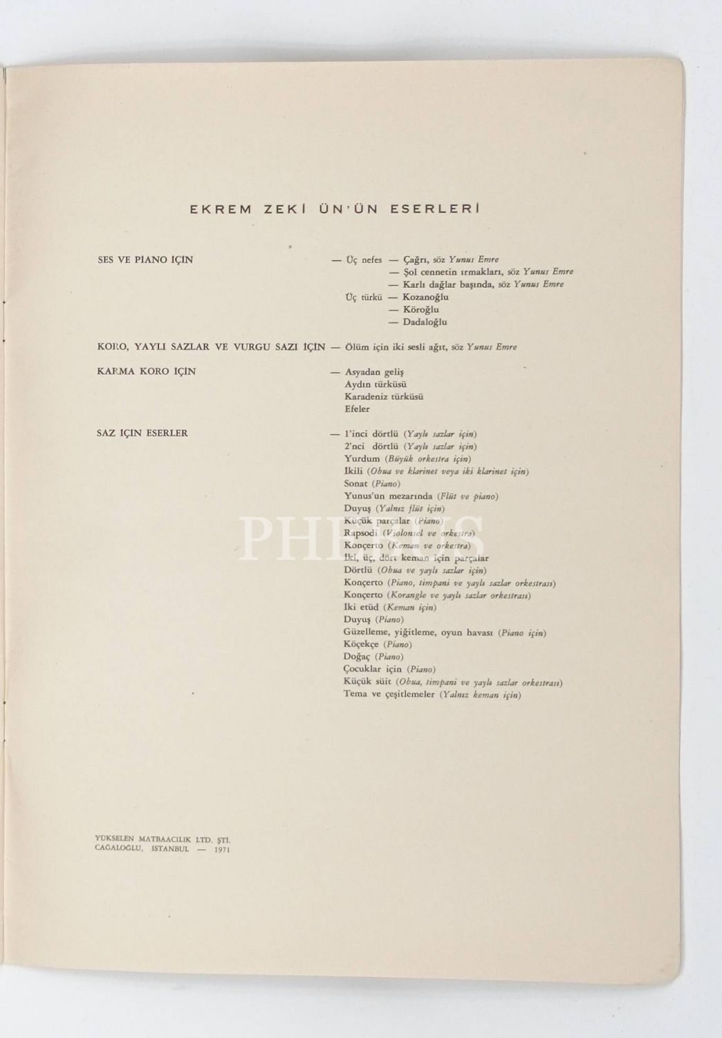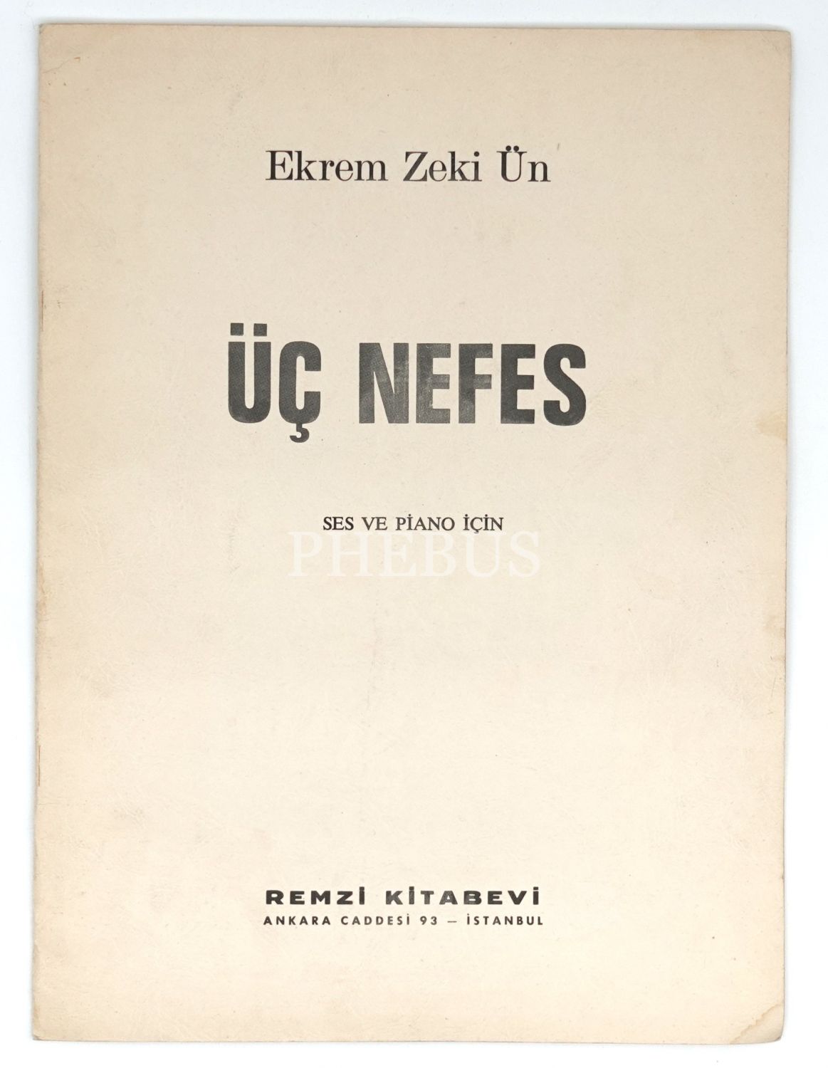 ÜÇ NEFES - Ses ve Piano için (Çağrı, Şol Cennetin Irmakları, Karlı Dağlar Başında), Ekrem Zeki Ün, Sözler: Yunus Emre, 1971, Remzi Kitabevi, Ankara, 16 sayfa, 25x33 cm...