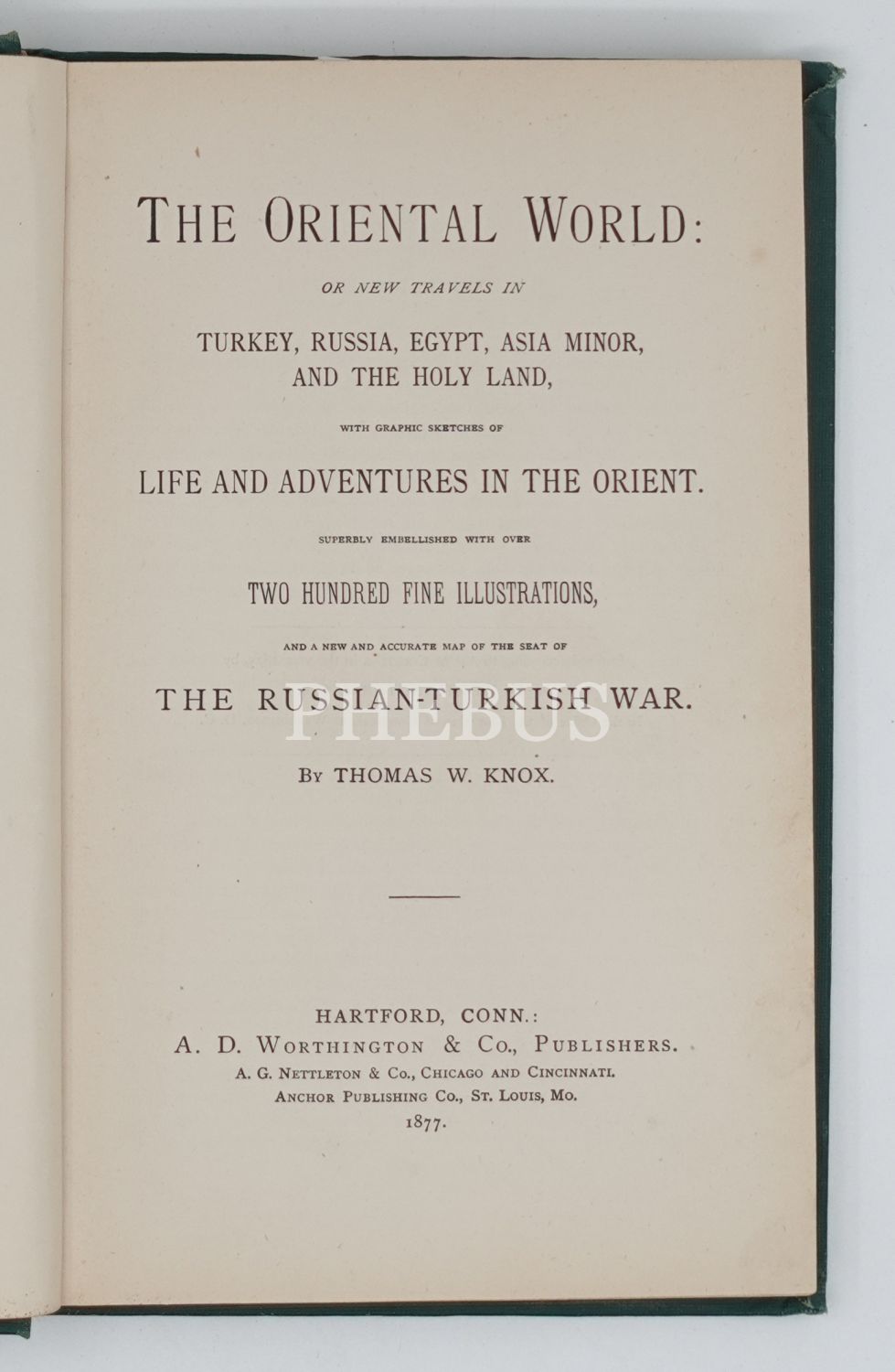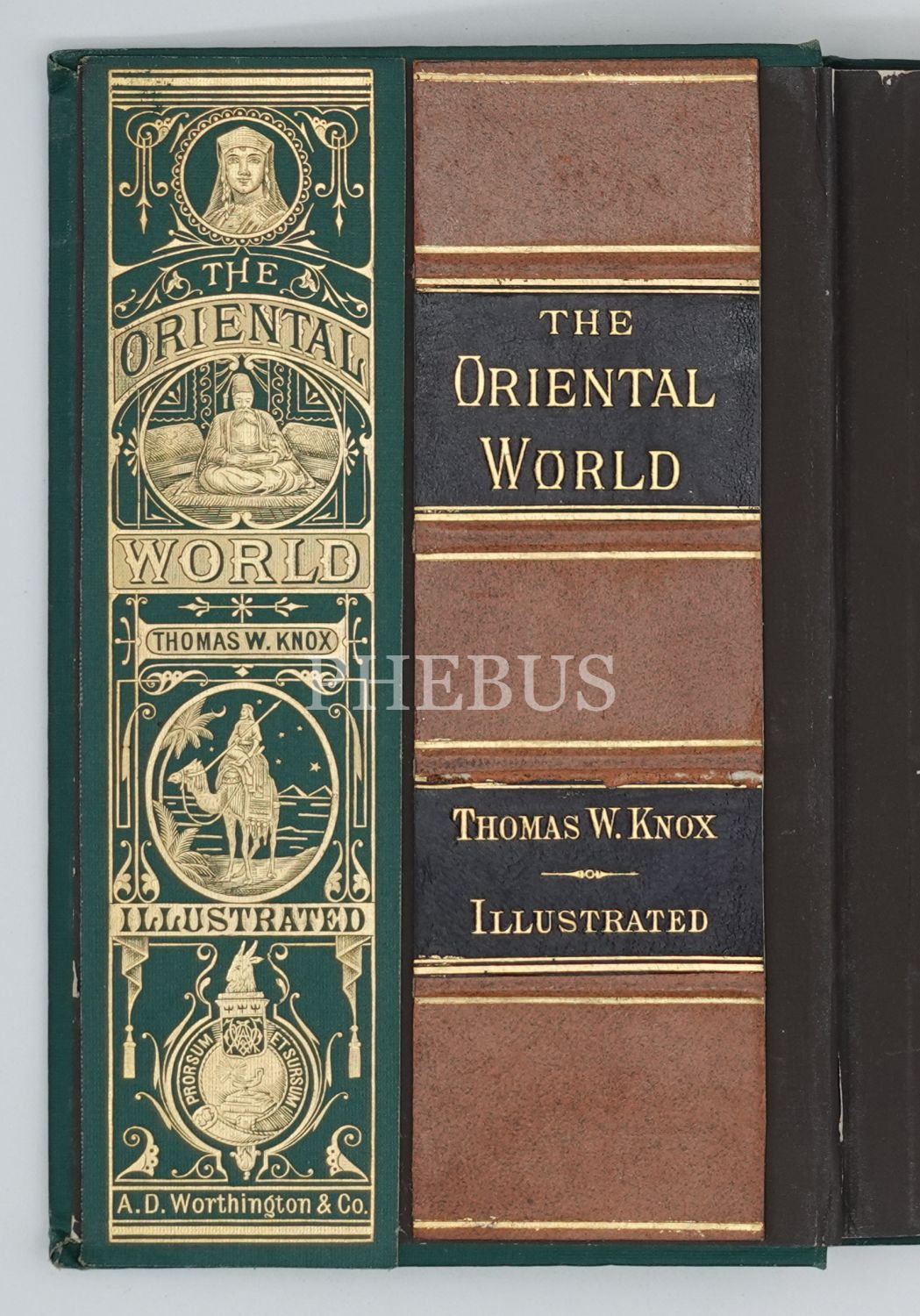 THE ORIENTAL WORLD, Thomas W. Knox, 1877, Hartford, Conn: A. D. Worthington & Co., Publishers, (Kitapçılar için bir tanıtım nüshası niteliğindeki kitabın sayfa numaraları sıralı değildir.) 15x23 cm...