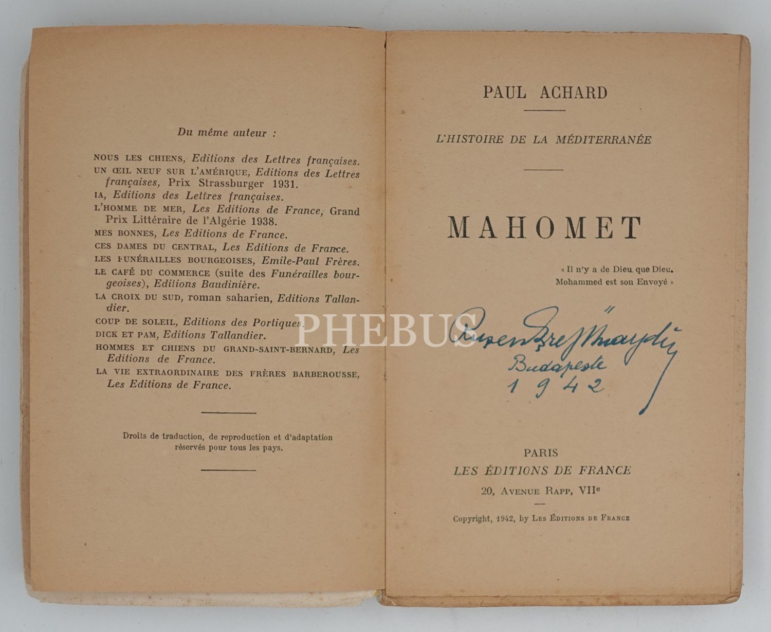Fransız gazeteci ve yazar Paul Achard´ın (1887-1962), İslam öncesi Arap milletinin tarihini de kapsama alarak hazırladığı Hz. Muhammed biyografisi... Ruşen Eşref Ünaydın tarafından "Budapeşte / 1942" notu düşülerek imzalanmış...