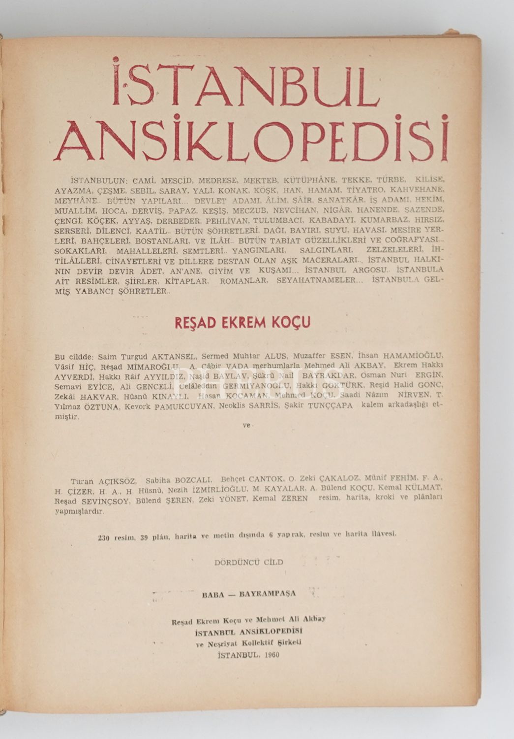 İSTANBUL ANSİKLOPEDİSİ (Dördüncü Cilt: BABA -- BAYRAMPAŞA), Reşat Ekrem Koçu, 1960, İstanbul Ansiklopedisi ve Neşriyat Kollektif Şirketi, İstanbul, 1734-2308. sayfalar arası, 21x28 cm...