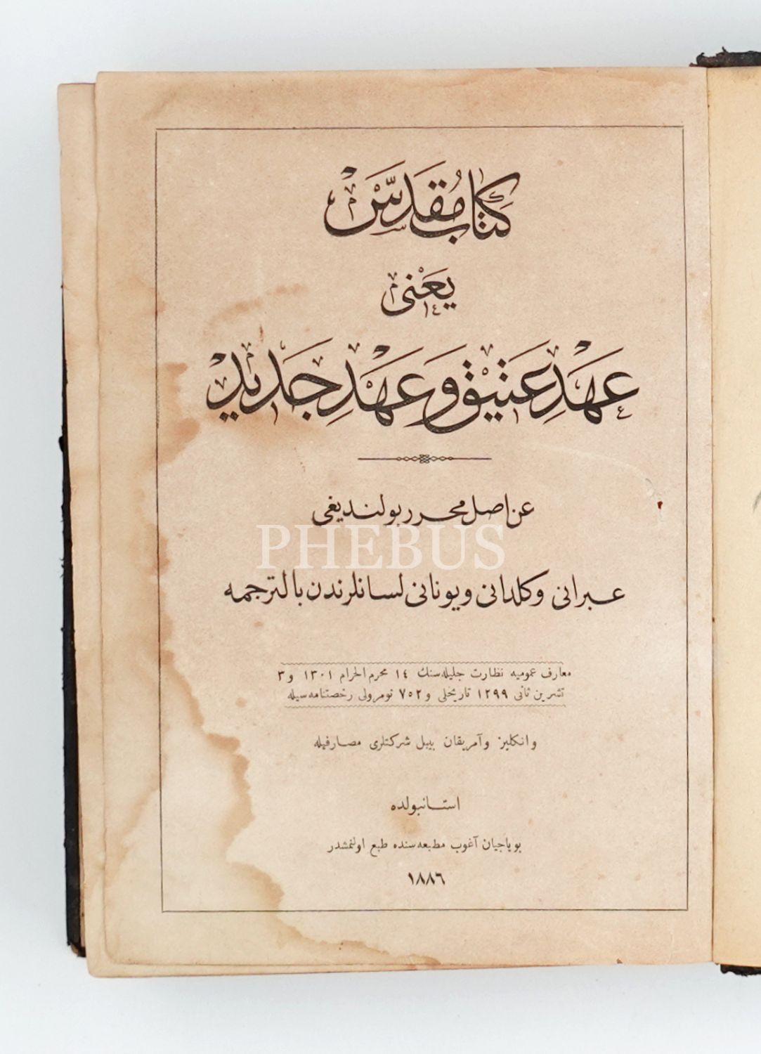 KİTÂB-I MUKADDES YANİ AHD-İ ATÎK VE AHD-İ CEDÎD (İbrânî ve Keldânî ve Yûnânî Lisânlarından Tercüme), 1888, Boyacıyan Agob Matbaası, 1023 s., 15x21 cm…