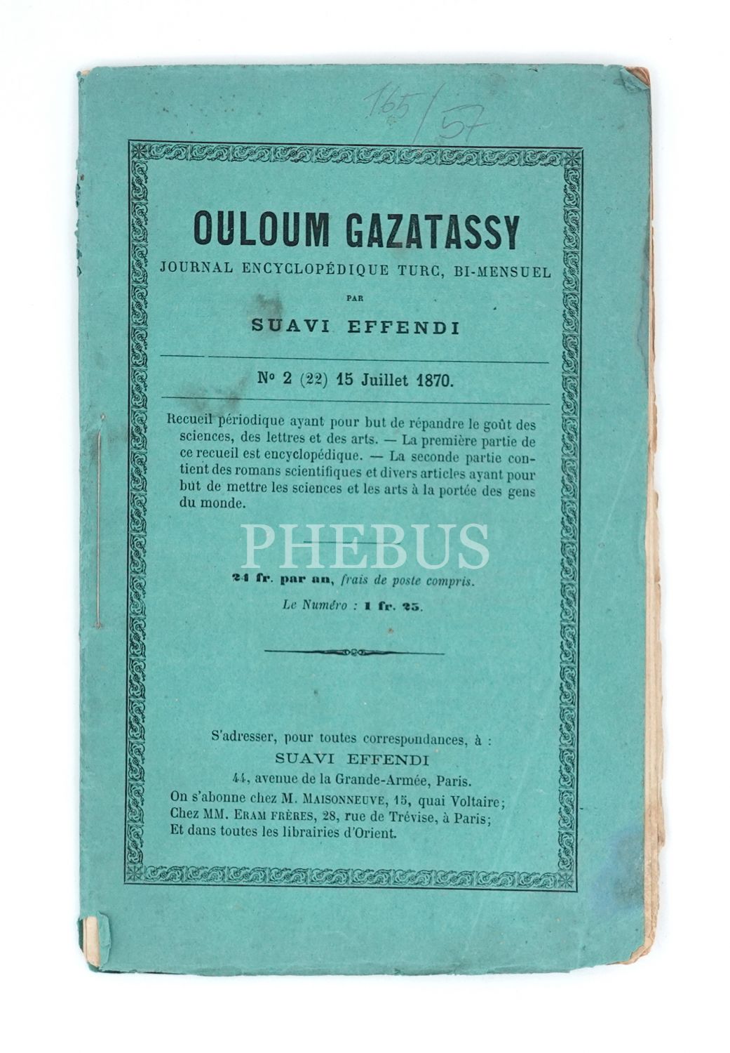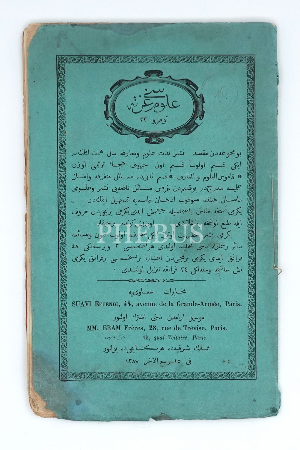 ULUM / OULOUM GAZATASSY, Numero 22, Ali Suavi, 1287 / 1870, Paris, 14x23 cm…