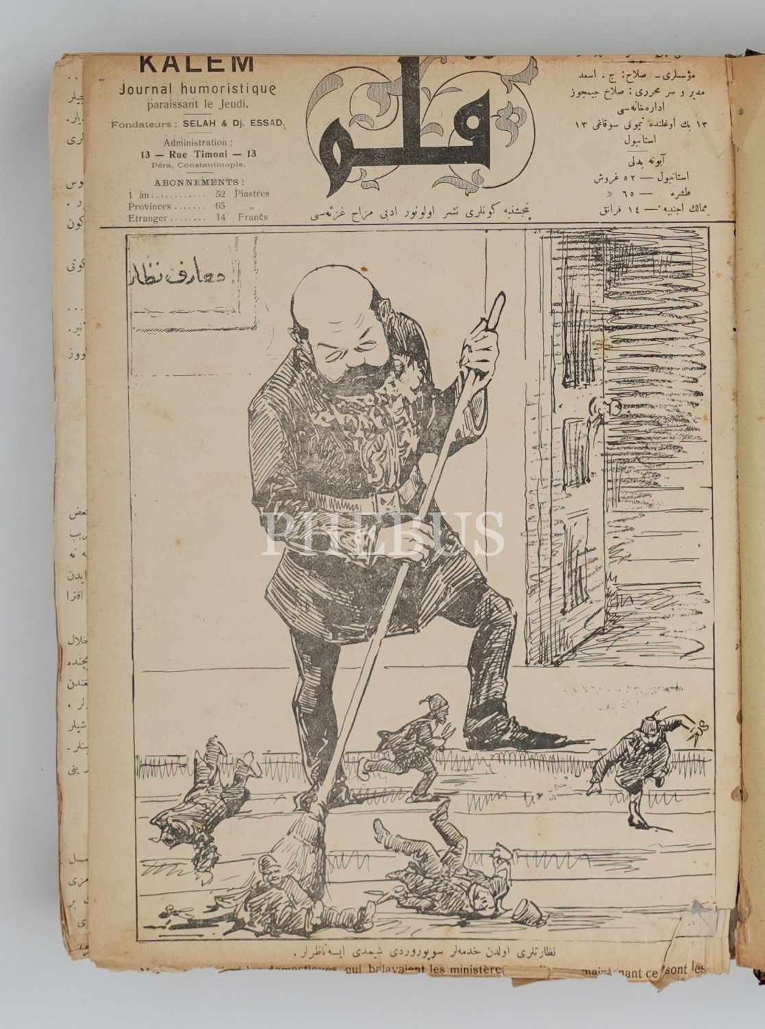 "Perşembe günleri neşr olunur, edebi mizah gazetesi" alt başlığıyla Türkçe - Fransızca yayımlanan Kalem, Meşrutiyet sonrasında Salah (Cimcoz) ve Celal Esad (Arseven) Beyler tarafından çıkarılmış, devrin birçok yazar ve çizerinin eserlerine yer vermiştir. İttihat ve Terakki yönetimine yönelik eleştirileri nedeniyle 130. sayısında kapatılan dergi, çağdaş Türk mizahı ve karikatürünün öncüsü olarak kabul edilir. *1. cildin 1. sayısının alt tarafında cilt dışına taşma nedeniyle kopukluklar vardır.
