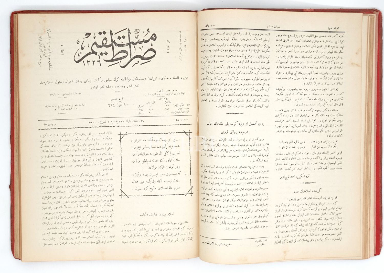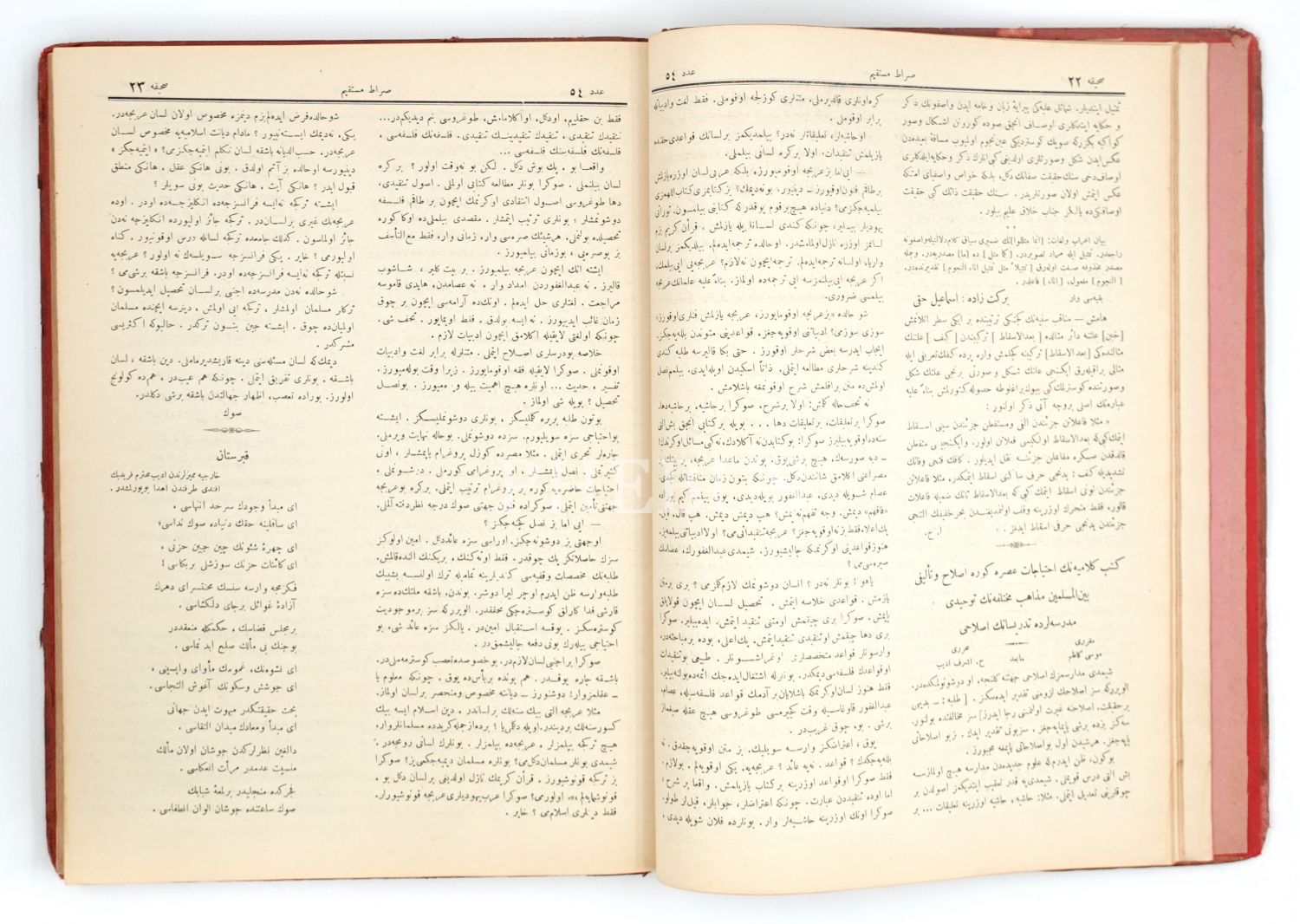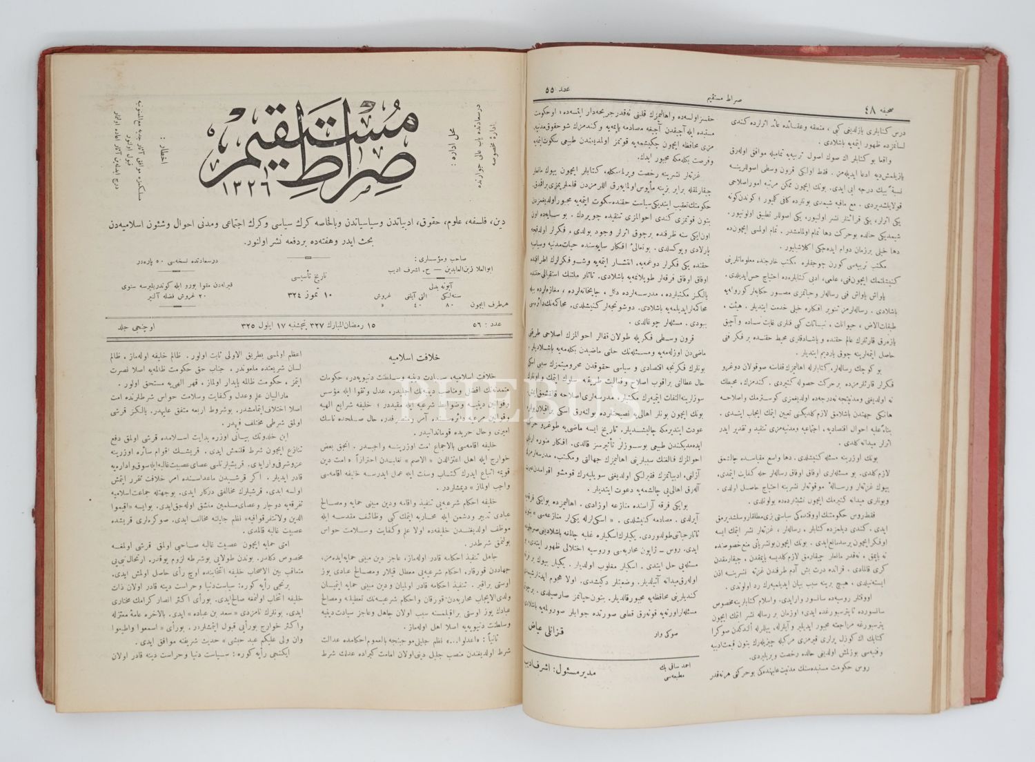"Din, Felsefe, Edebiyat ve Hukuk-u Ulûmdan Bahseden Haftalık Risale" SIRAT-I MUSTAKİM´in, 24 Şaban 1327 ilâ 12 Safer 1328 tarihleri arasında yayınlanan, 53´den 78´e kadar 25 sayısı, 422 sayfa, 25x34 cm...