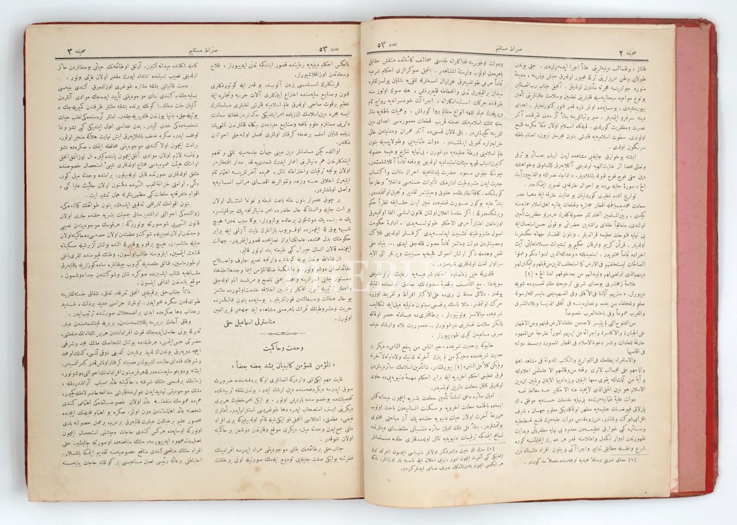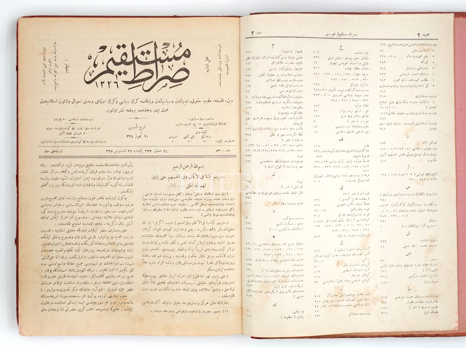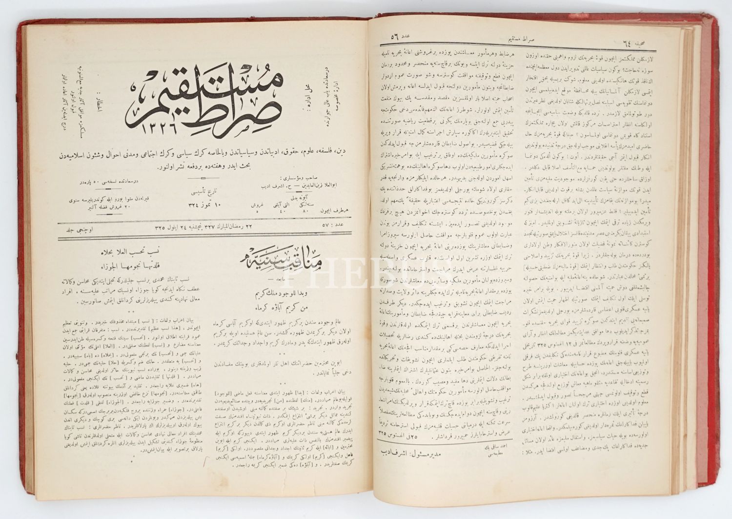 "Din, Felsefe, Edebiyat ve Hukuk-u Ulûmdan Bahseden Haftalık Risale" SIRAT-I MUSTAKİM´in, 24 Şaban 1327 ilâ 12 Safer 1328 tarihleri arasında yayınlanan, 53´den 78´e kadar 25 sayısı, 422 sayfa, 25x34 cm...