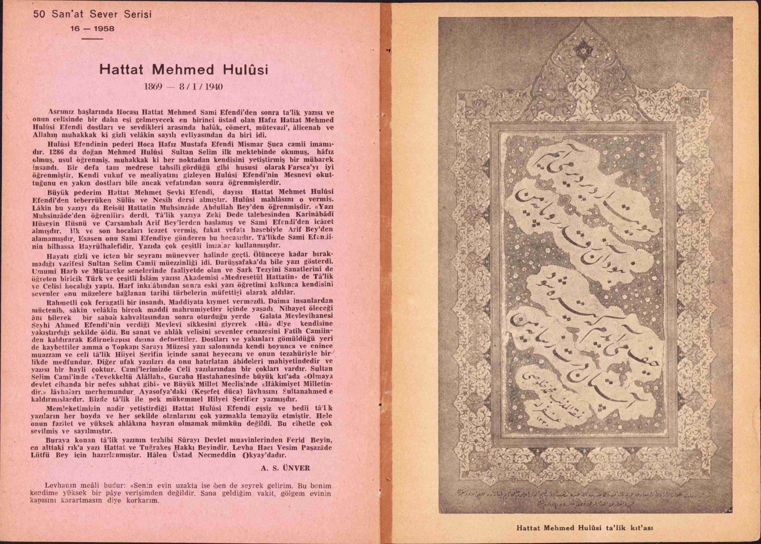 50 San'at Sever Serisi: 16, Hattat Mehmed Hulusi, A. Süheyl Ünver, İstanbul, 1958, 3 sayfa, 16x24 cm