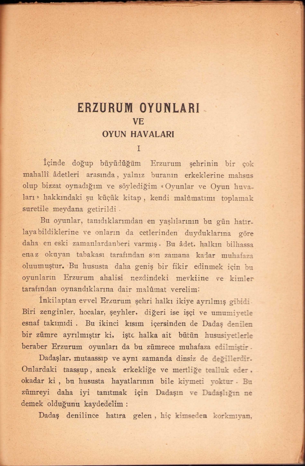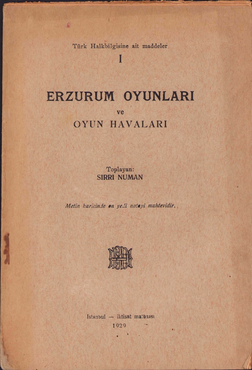 Türk Halkbilgisine ait maddeler I Erzurum Oyunları ve Oyun Havaları, toplayan Sırrı Numan, metin haricinde on yedi nota mevcut, İstanbul, 1929, 18 sayfa, 16x24 cm