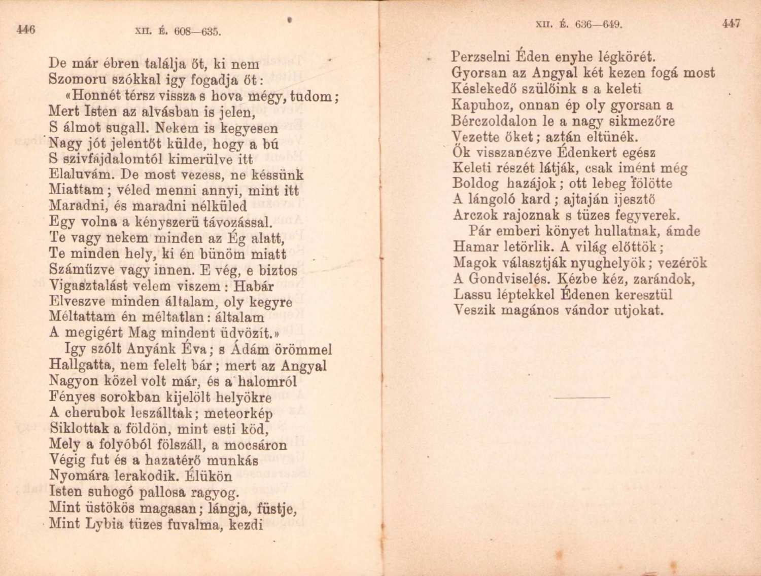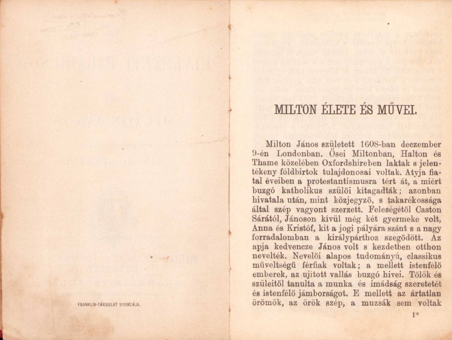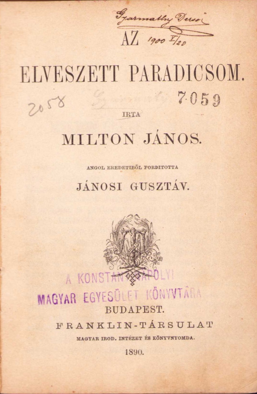 Az Elveszett Paradicsom - Macarca Kayıp Cennet, Milton Janos, Budapeşte, 1890, cilt sırtı kenarı haliyle, 447 sayfa, 11x15 cm