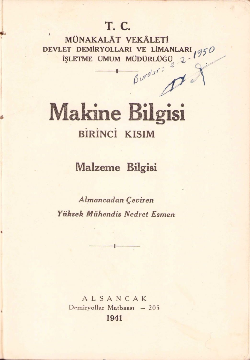 Makine Bilgisi - birinci kısım: Malzeme Bilgisi, Nedret Esmen, Demiyolları Matbaası, Alsancak, 1941, yazarından imzalı, şekilli, 183 sayfa, 14x20 cm