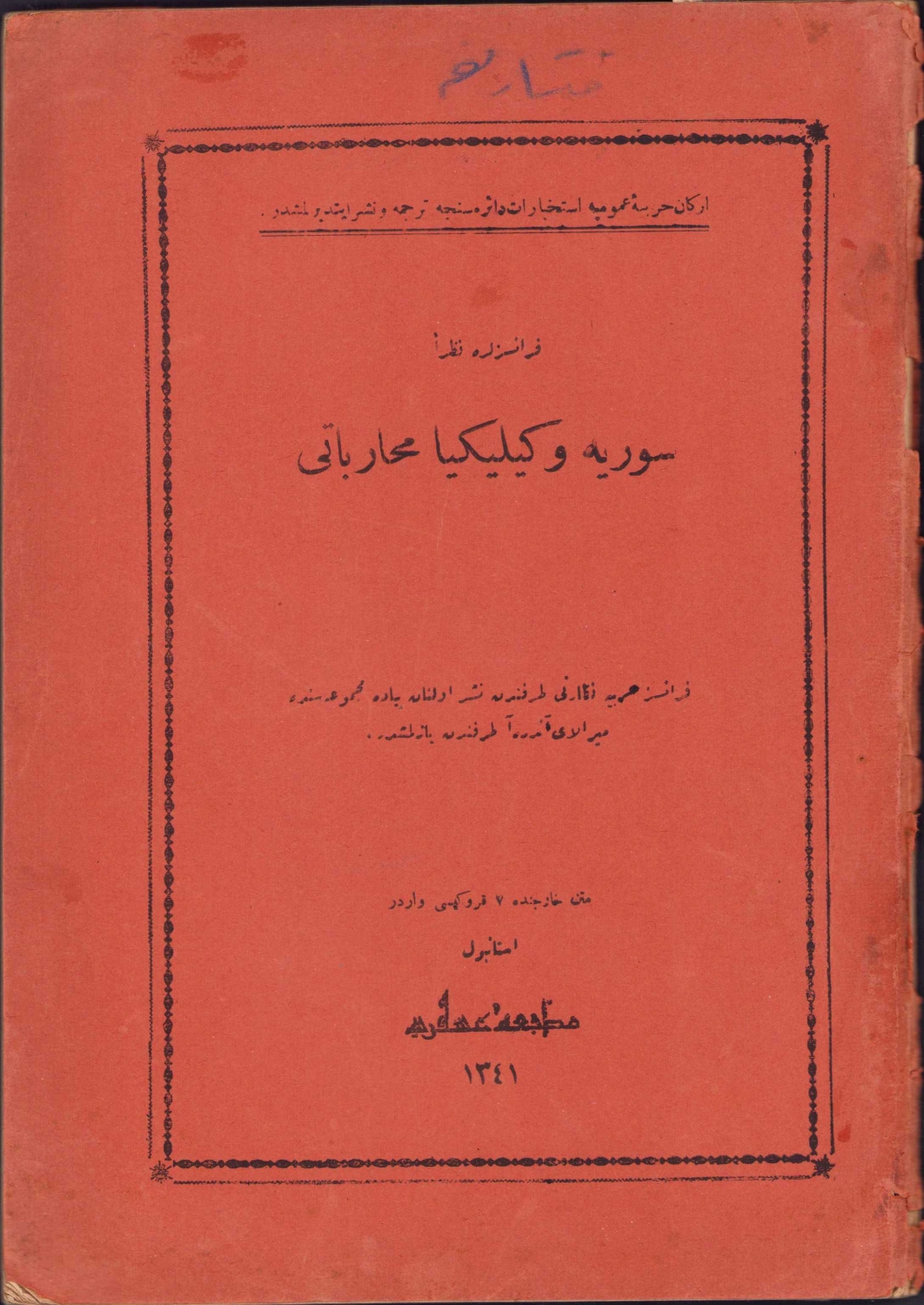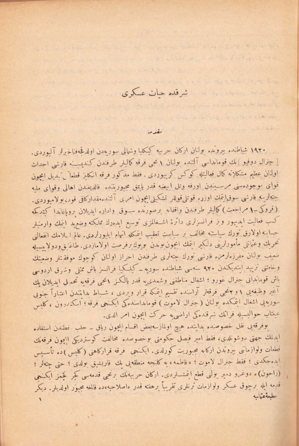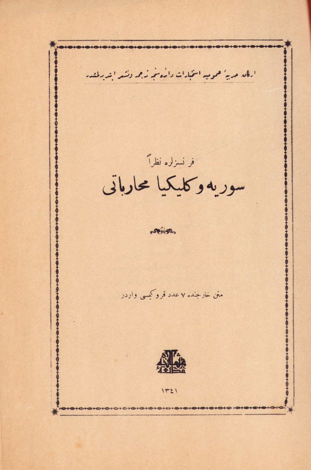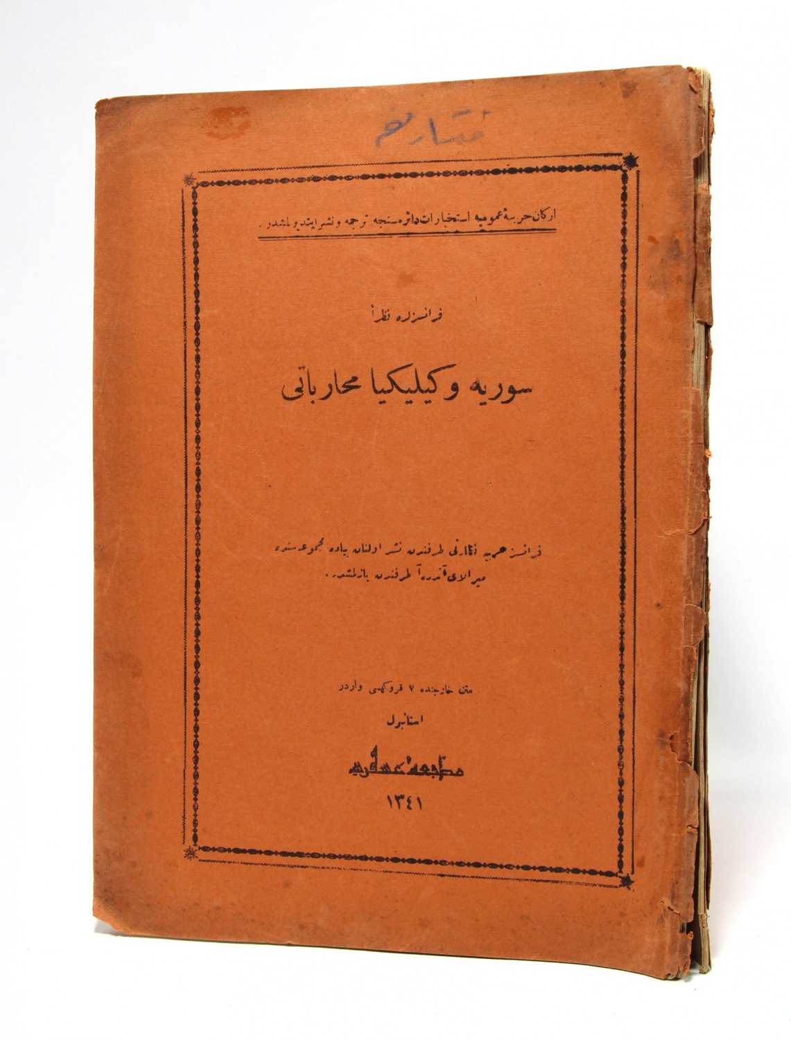 Osmanlıca Fransızlara Nazaran Suriye ve Kilikya Muharebatı, Andrea, çev., Kadri, Matbaa-i Askeri, İstanbul, 1341, ek 7 kroki mevcut, sırtı haliyle, 104 sayfa, 16x24 cm, ÖZEGE; 5948