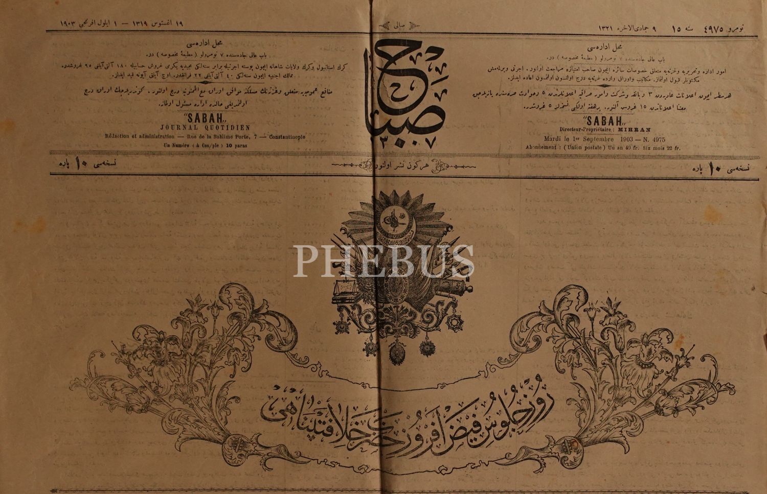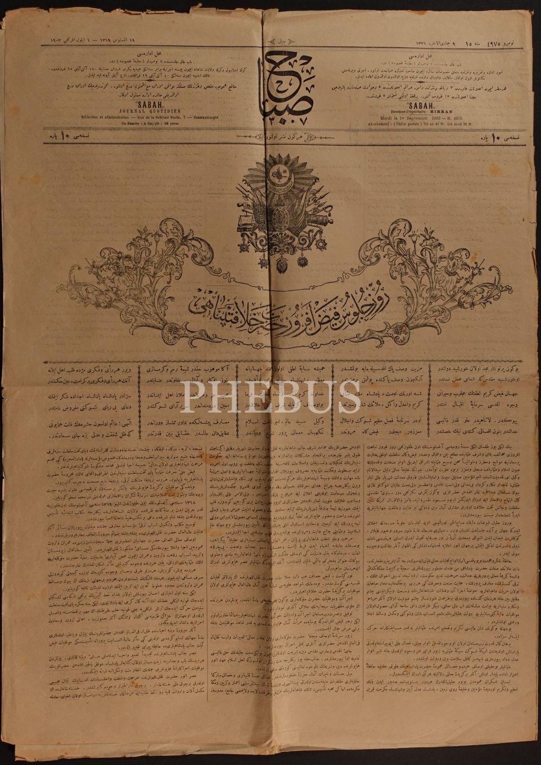 II. Abdülhamid´in saltanatının 28. Sene-i Devriyesini kutlayan kapağıyla, Sabah gazetesinin 9 Cemaziyelahir 1321 tarihli 4975. sayısı, 4 sayfa, 47x65 cm...