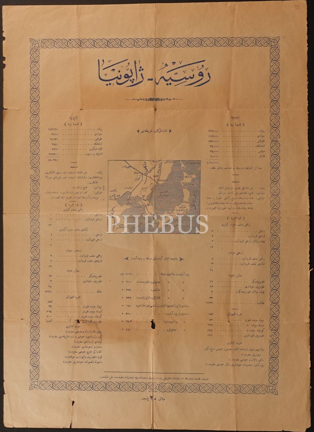 Rusya-Japonya muharebesine dair ayrıntılı bilgiler içeren haritalı afiş, Saryan Matbaası, 40x57 cm...