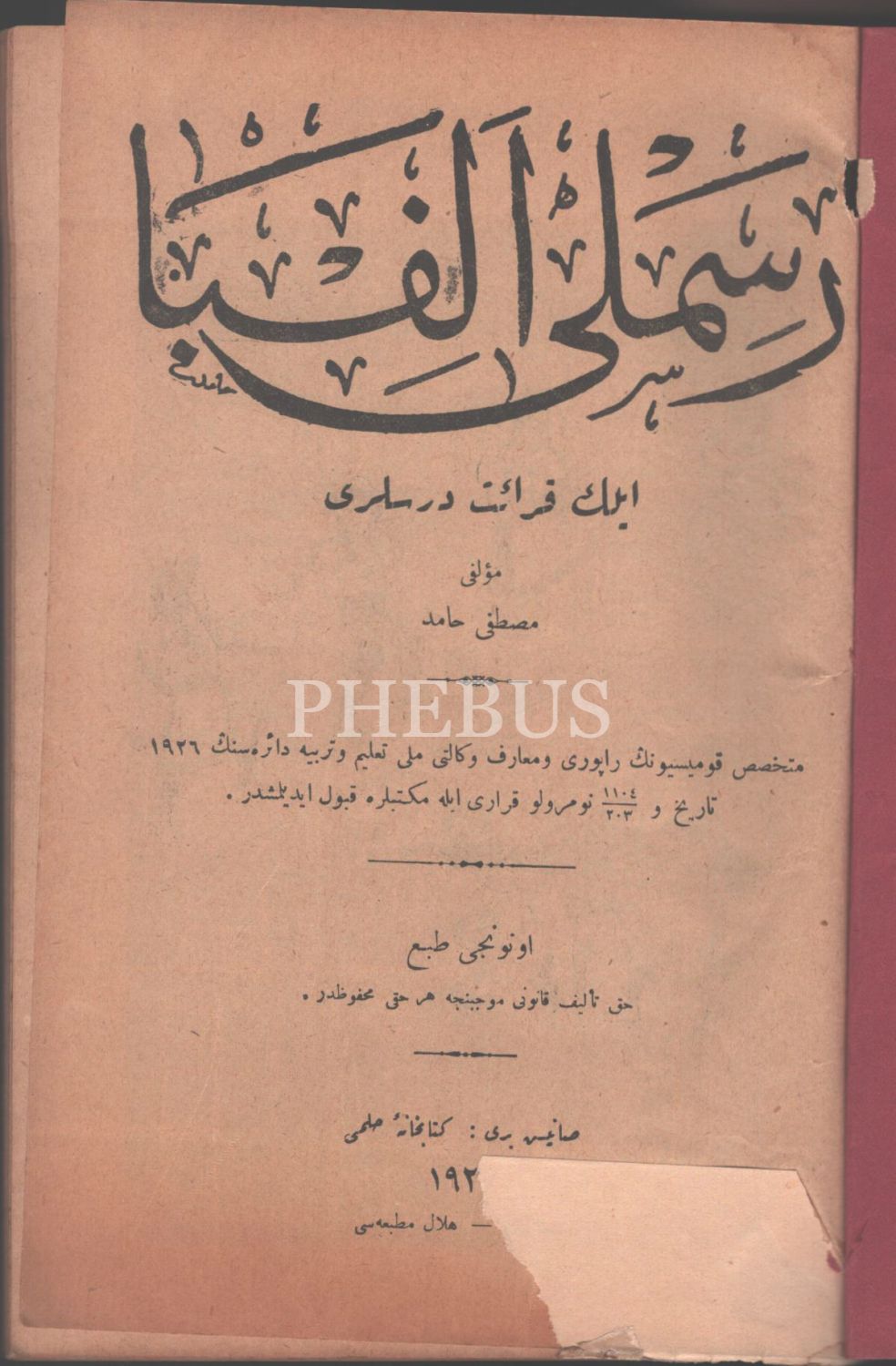 RESİMLİ ELİFBÂ (İlk Kıraat Dersleri), Mustafa Hamid, 1927, İstanbul Hilal Matbaası, 80 sayfa, 15x23 cm...