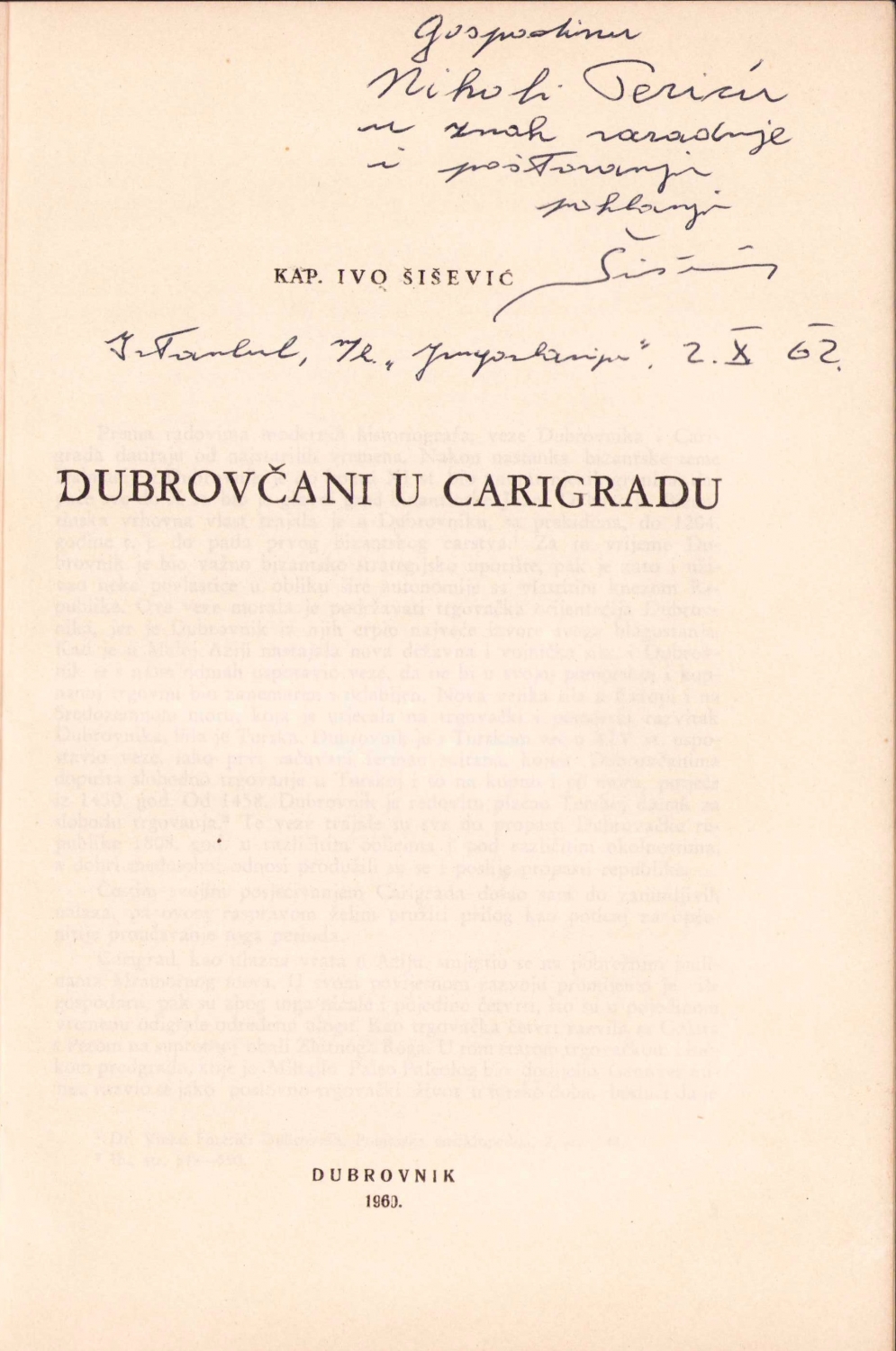 Dubrovcani U Carigradu, Kap. Ivo Sisevic, Dubrovnik, 1960, Hırvatça, yazarından imzalı, 20 sayfa, 16x24 cm