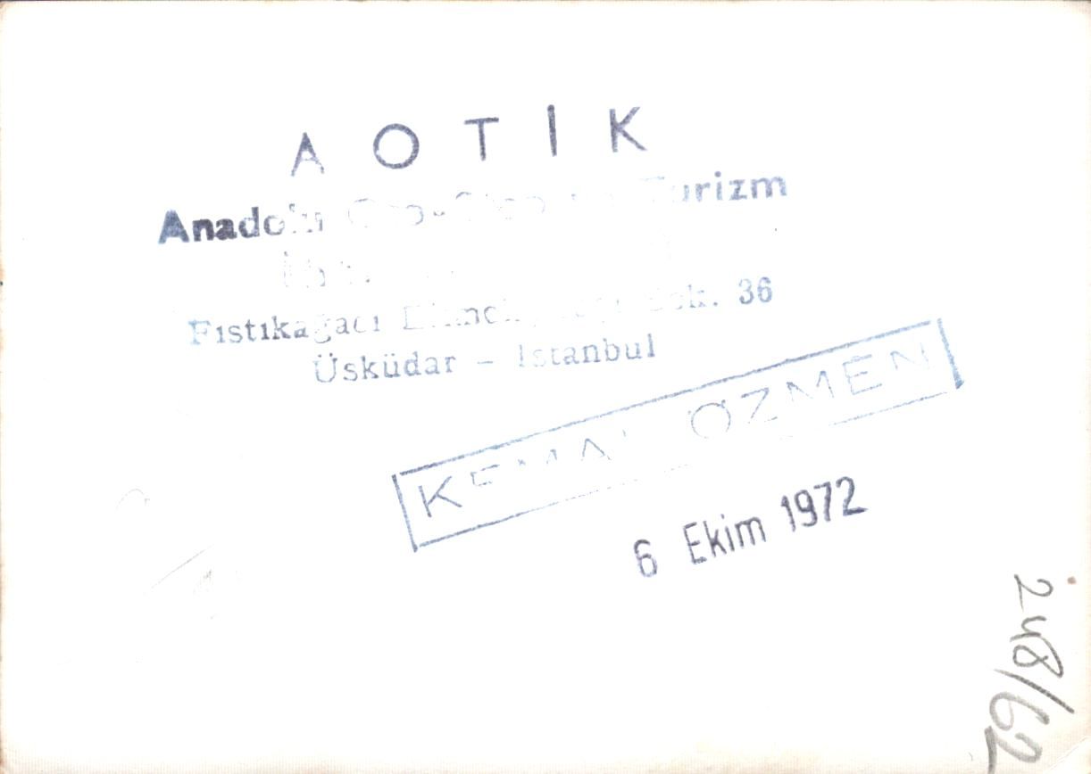 Fotoğraflardan birini arka yüzünde, "Aotik Anadolu Oto-Step Turizm İhtisas Kulübü, Kemal Özmen 6 Ekim 1972" yazılı kaşe mevcuttur.