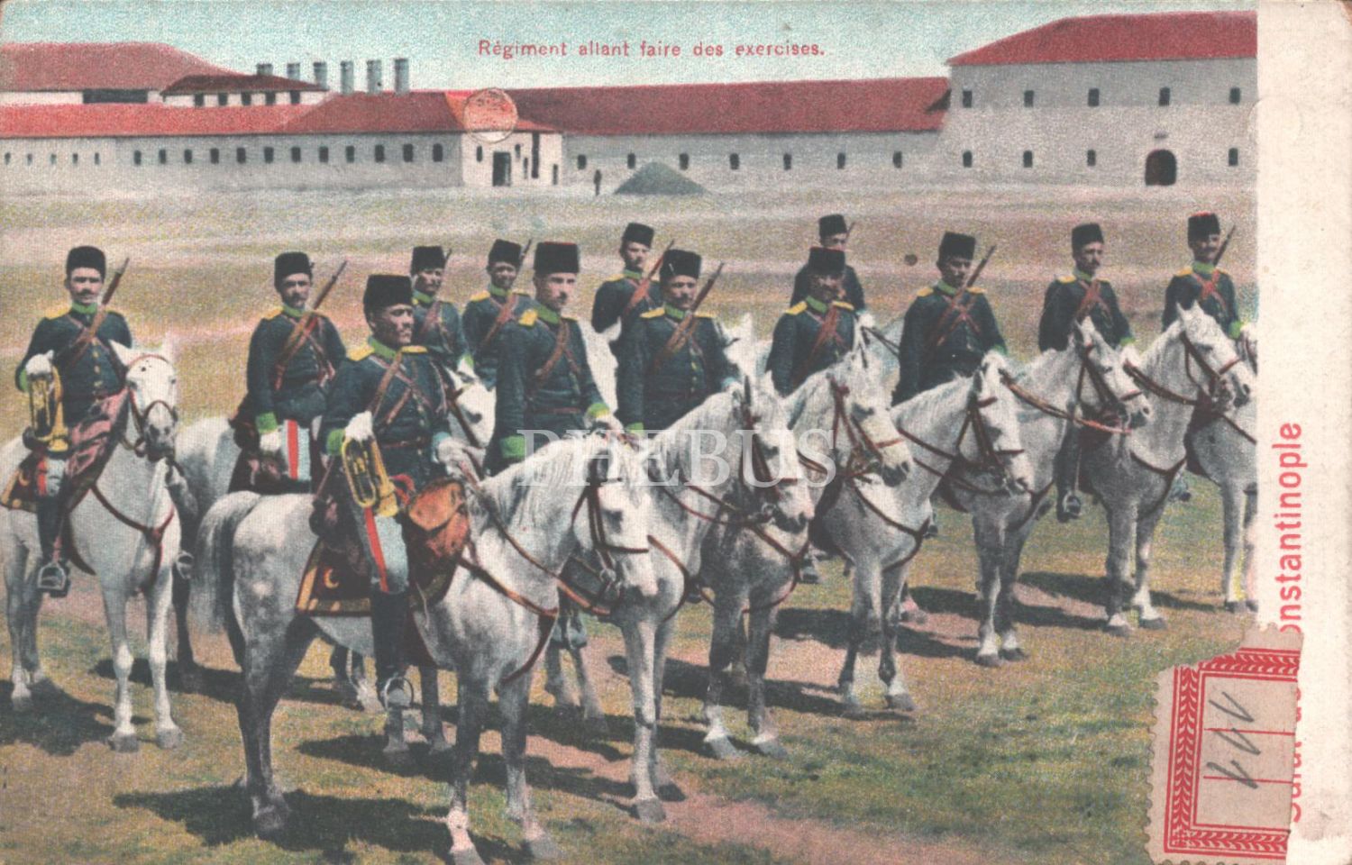 Selimiye Kışlası´nda Osmanlı süvarileri, "Reğiment aliant faire des exercises", 14x9 cm...