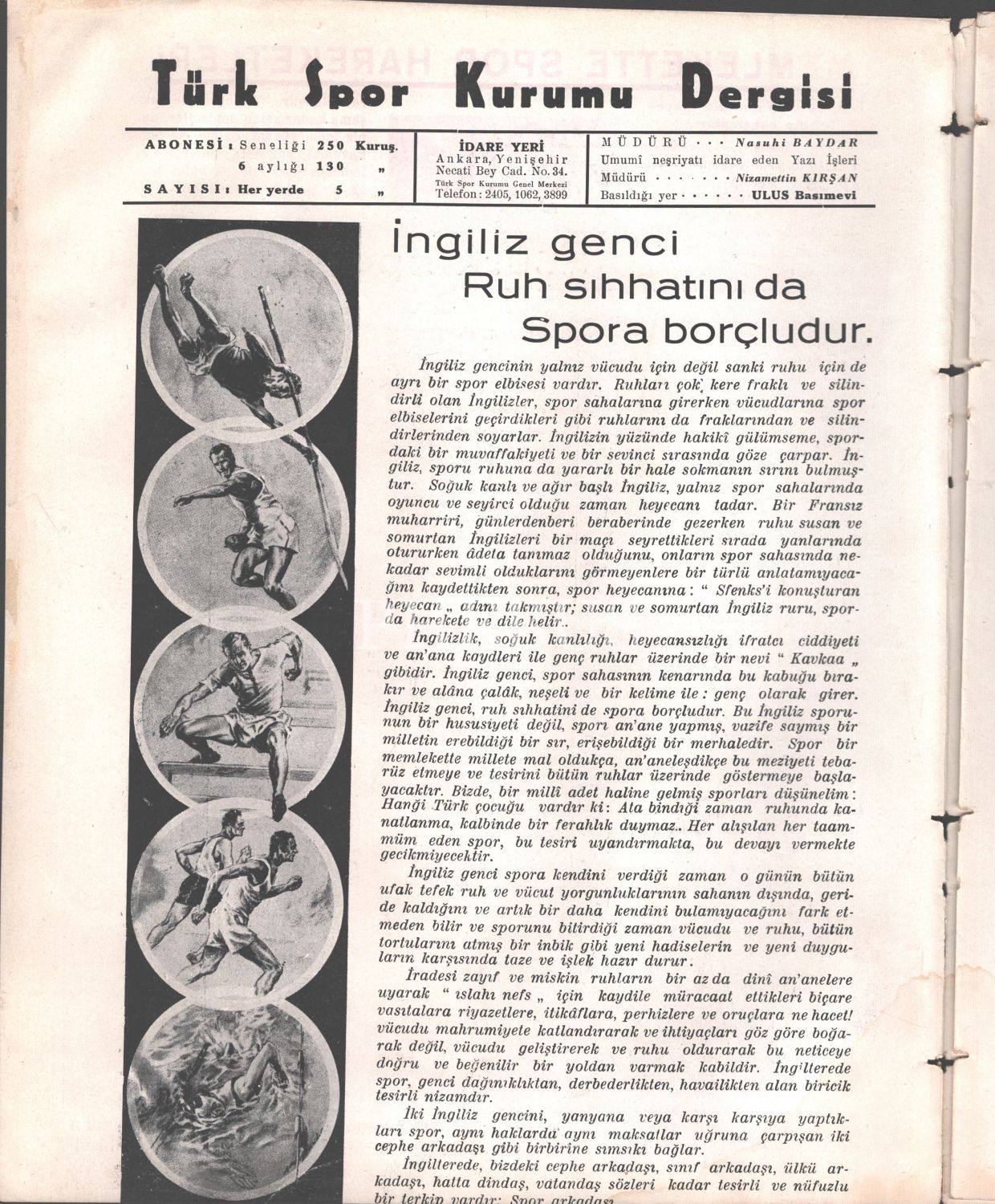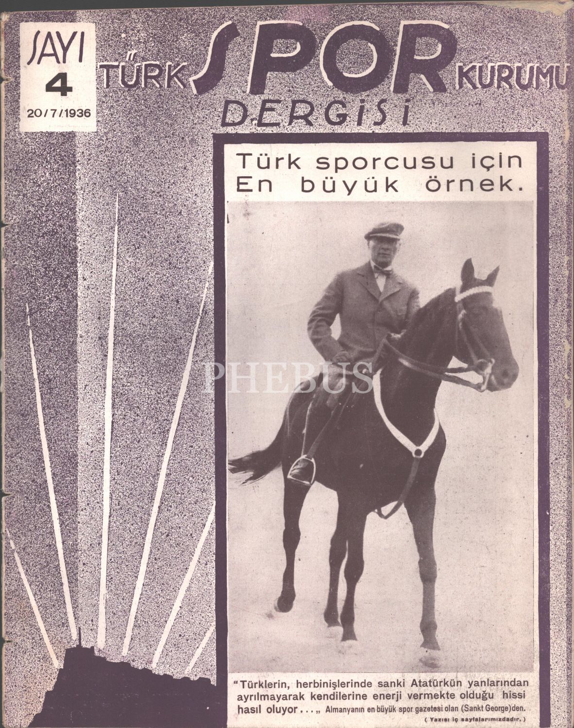 Kapağında Mustafa Kemal Atatürk´ün at üzerinde fotoğrafının yer aldığı, TÜRK SPOR KURUMU DERGİSİ´nin 20 Temmuz 1936 tarihli 4. sayısı, 16 sayfa, 25x31 cm...