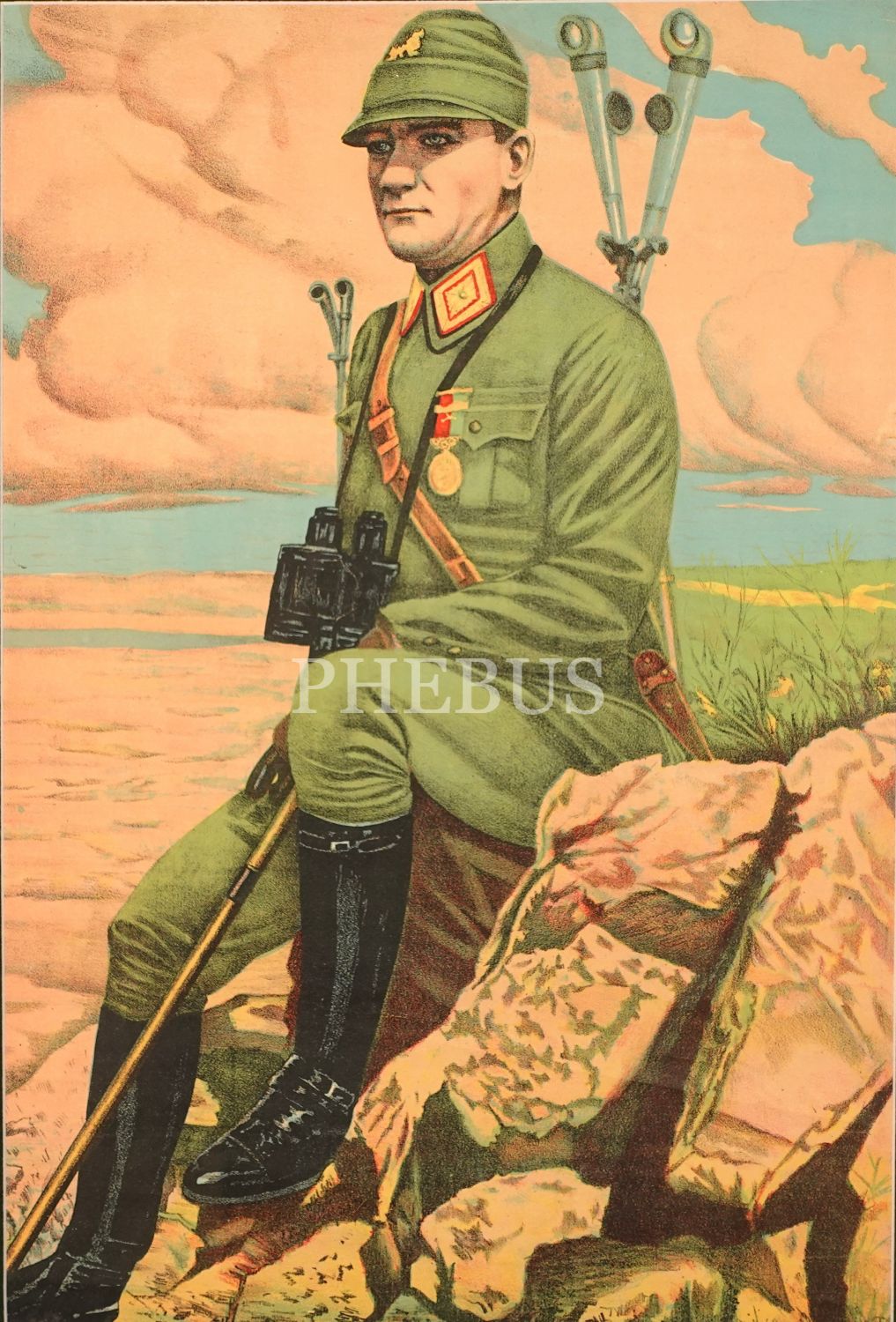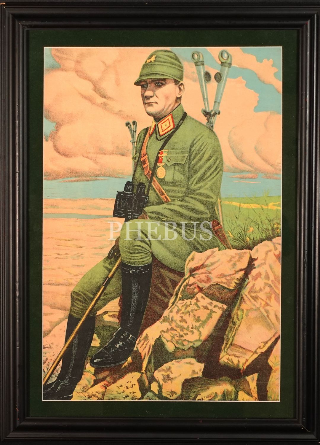 İstiklâl madalyalı Mustafa Kemal Atatürk´ü cephede resmeden poster, çerçeveli, çerçeve: 49x67 cm
