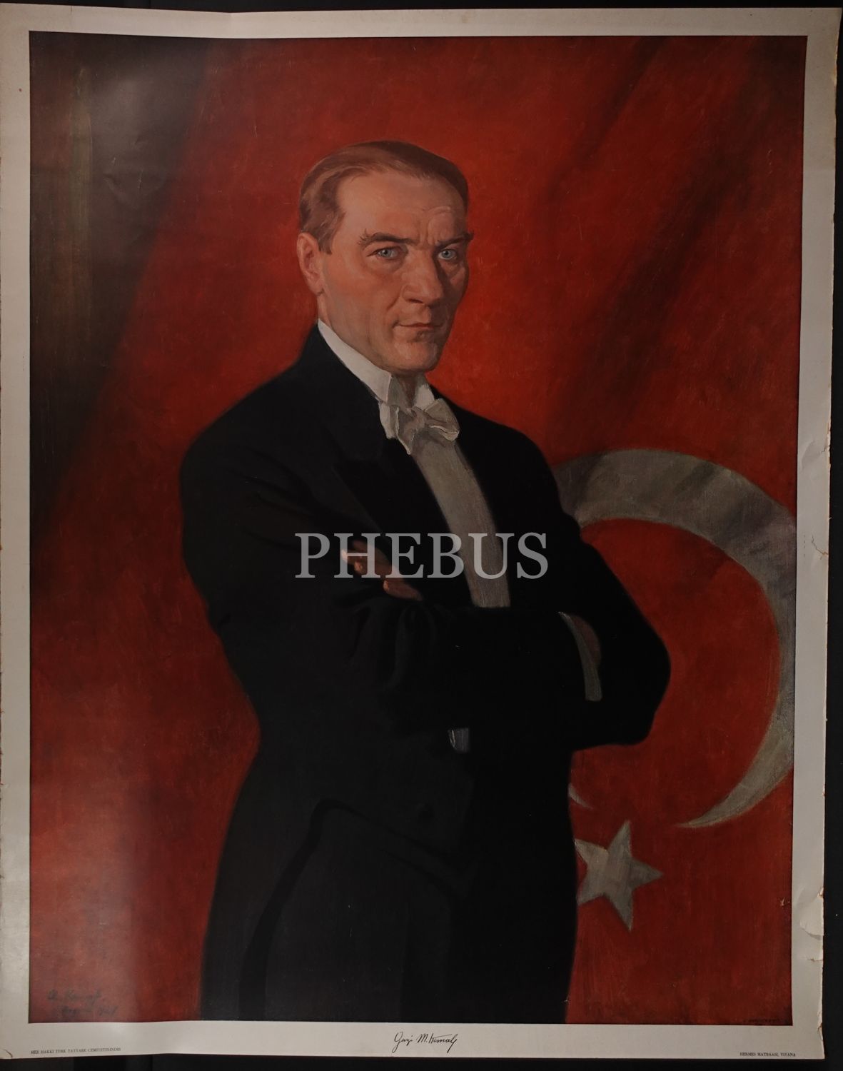 Arthur Kampf tarafından yapılan Türk bayrağı önünde Mustafa Kemal Atatürk´ü gösteren poster, Viyana Hermes Matbaası, 87x110 cm...