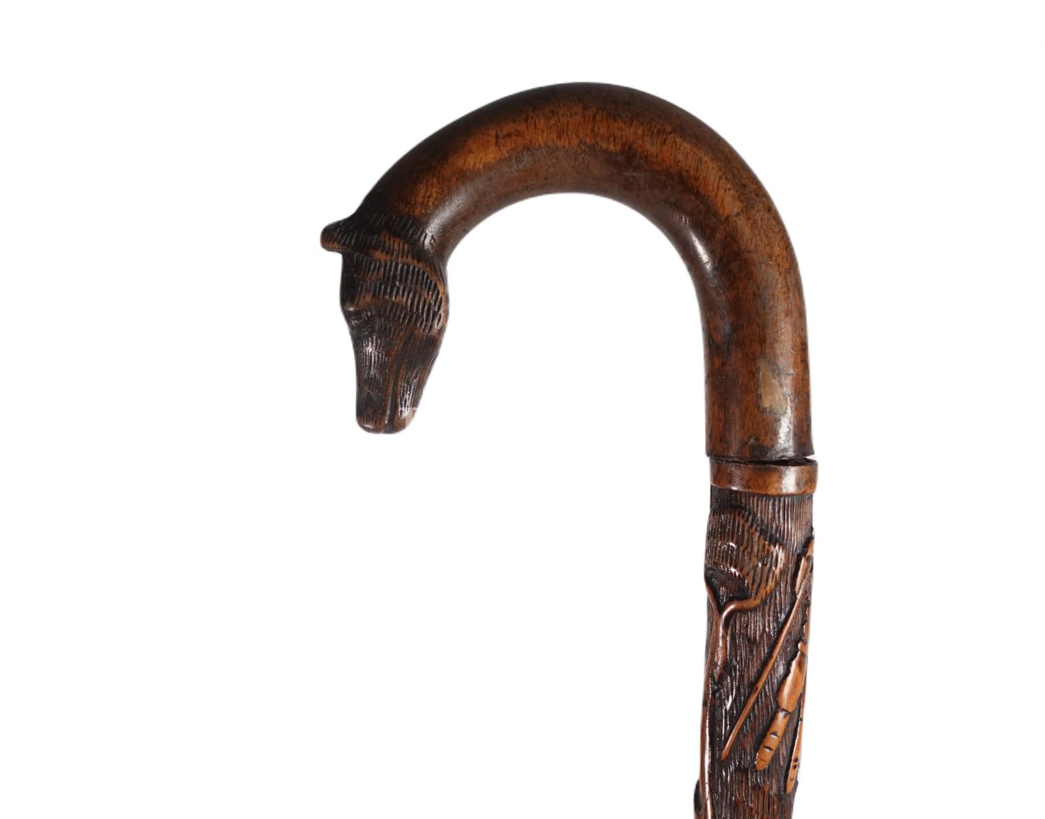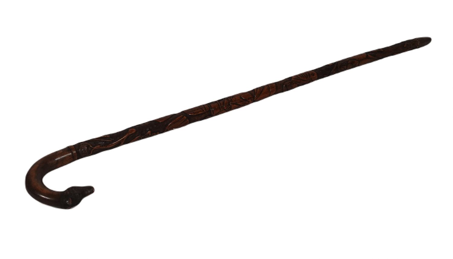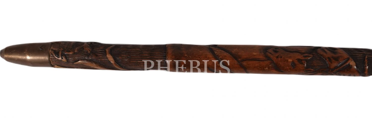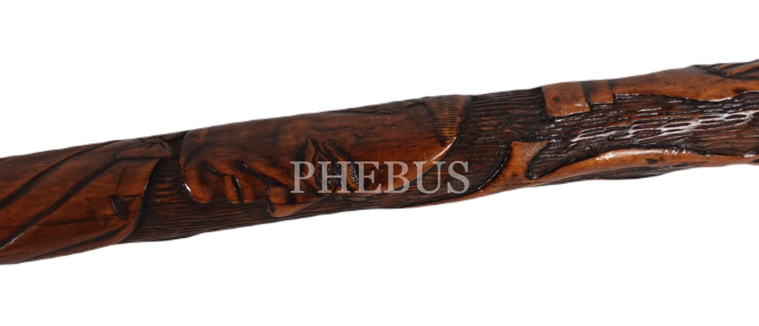 Ahşap oyma kurt başlı, "T.C." ve Mustafa Kemal Atatürk kabartmalı baston, 98 cm...