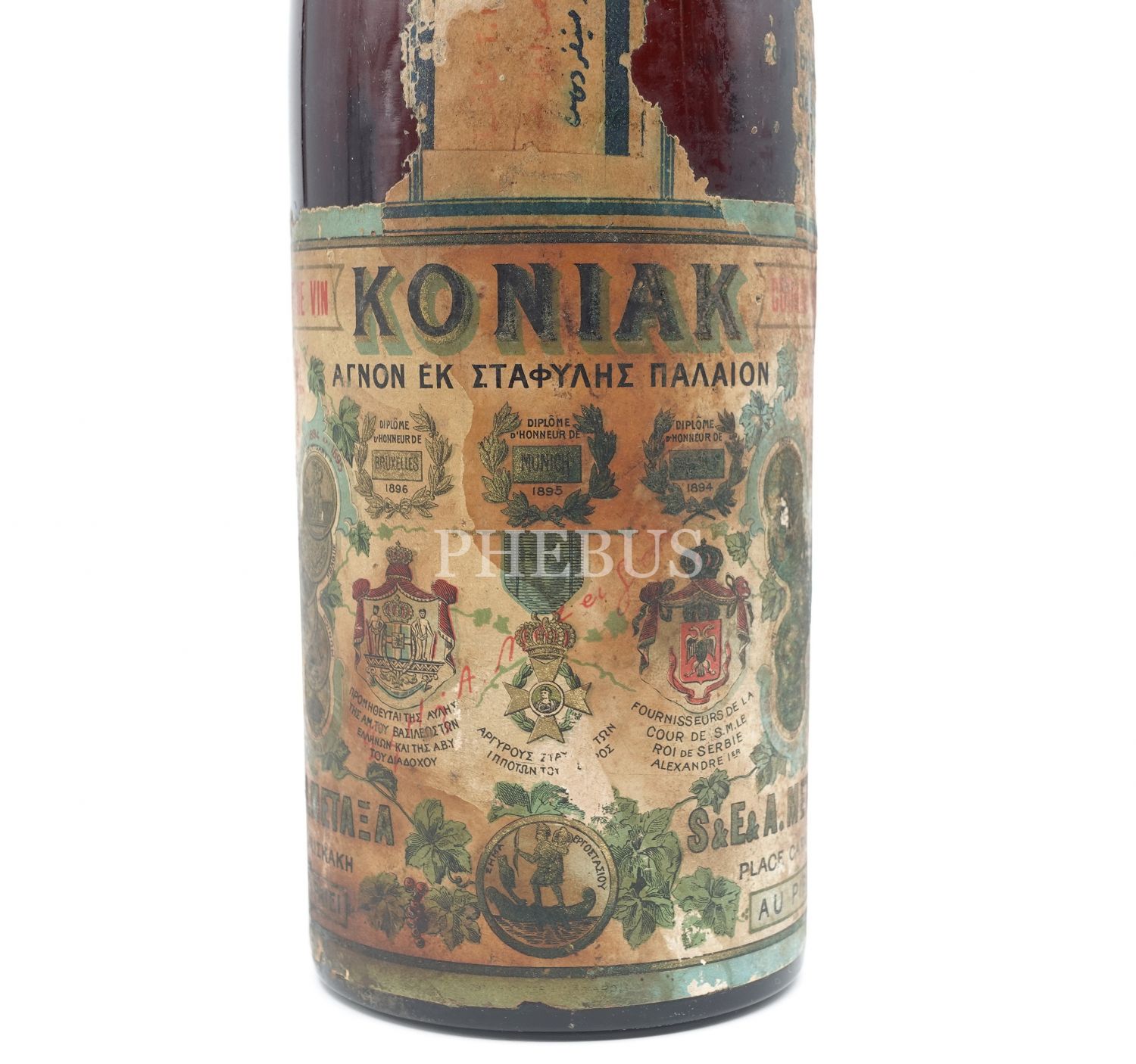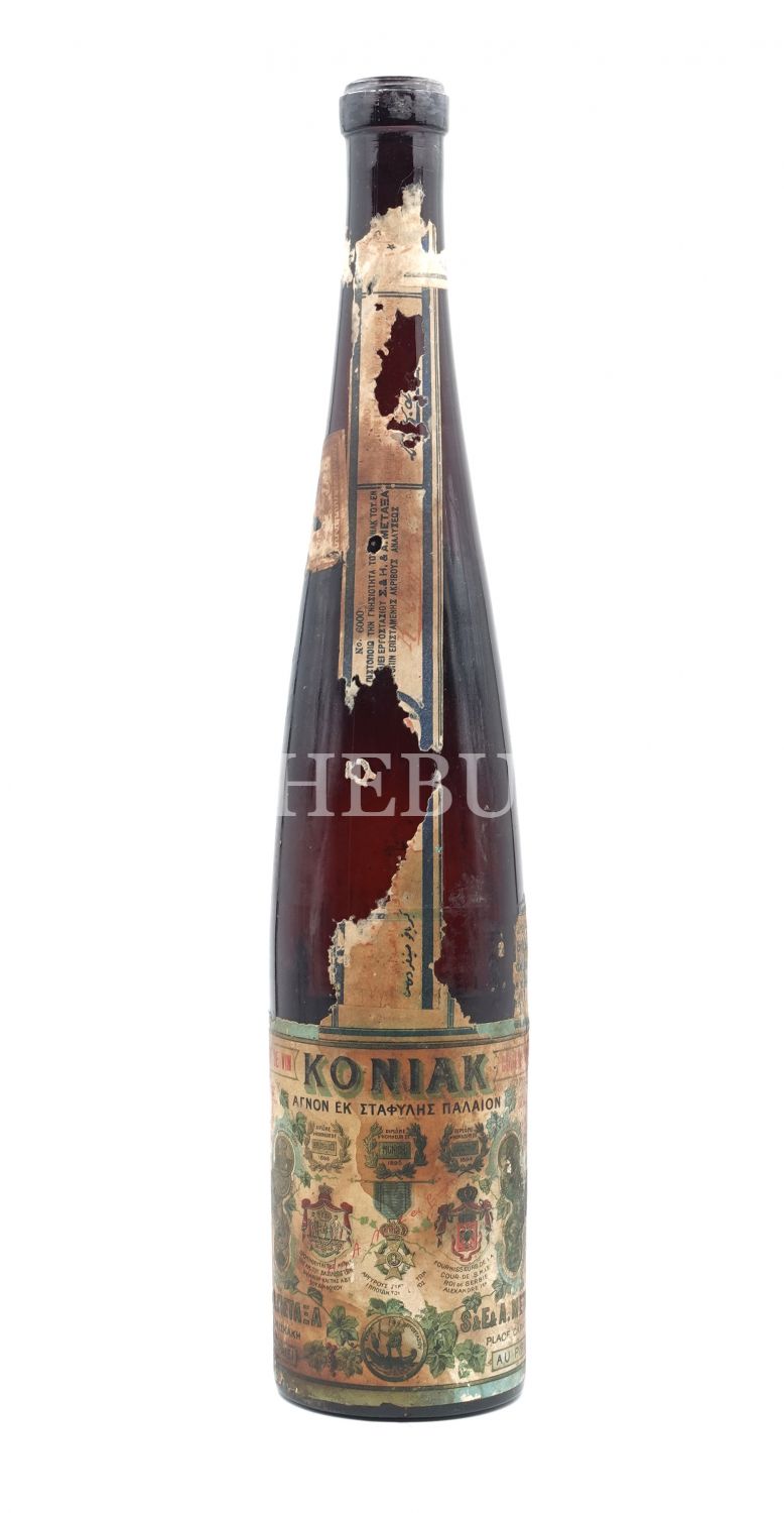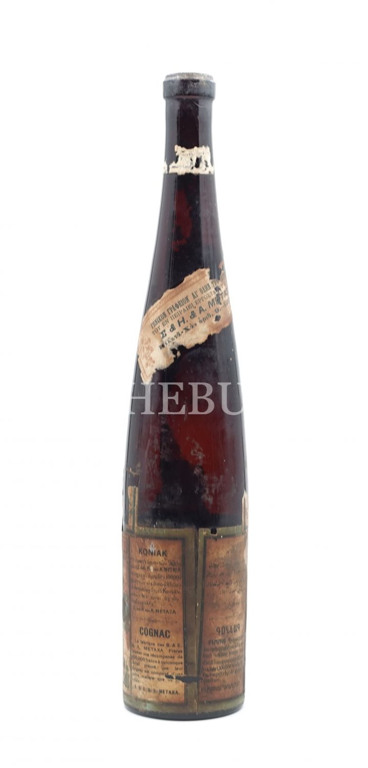 Üzerinde dört dilli etiketi ile Osmanlı döneminden kalma konyak şişesi, Osmanlıca, Rumca, Fransızca ve Ermenice, 37 cm...