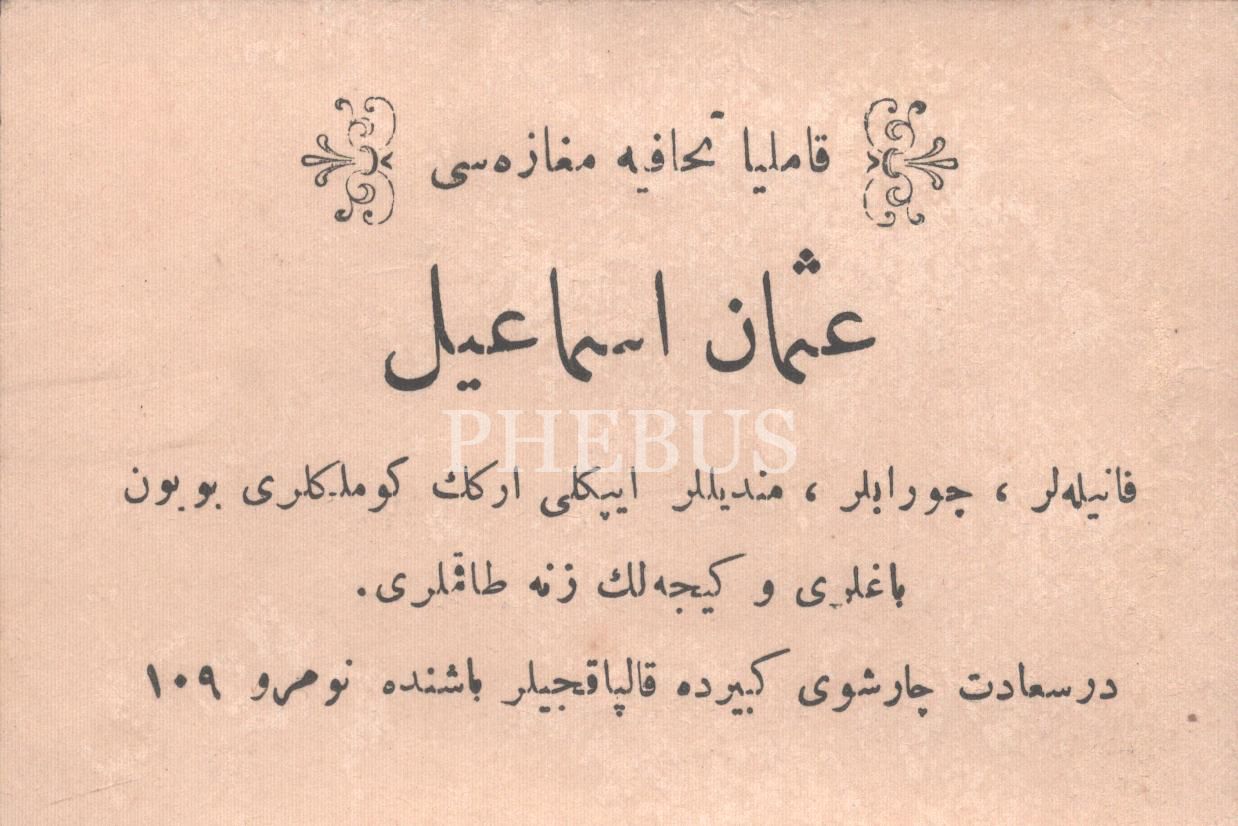 Kapalıçarşı´da Kamelya Tuhafiye Mağazası´nın Osmanlıca iş yeri kartı,