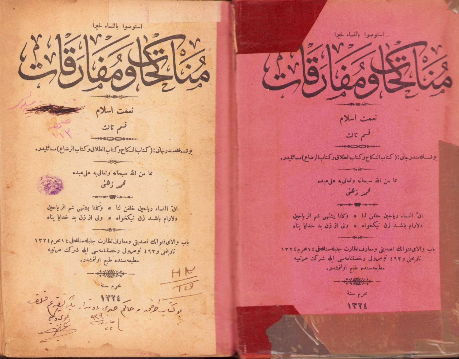 Osmanlıca Münakehat ve Müfarekat - ikinci kısım, Mehmed Zihni, Şirket-i Mürettibiye Matbaasıİstanbul, 1324, ön ve arka kapak haliyle, 290 sayfa, 14x20 cm